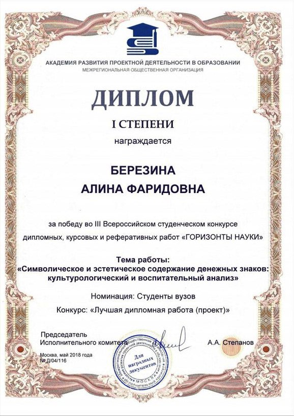 Организатором специального студенческого конкурса всероссийского масштаба выступила Межрегиональная общественная организация «Академия развития проектной деятельности в образовании» (г. Москва). По итогам III Всероссийского студенческого конкурса «Горизонты науки» дипломом I степени удостоена работа Березиной Алины Фаридовны по теме "Символическое и эстетическое содержание денежных знаков: культурологический и воспитательный анализ". Магистрантка участвовала в конкурсной номинации «Студенты вузов» под руководством доктора педагогических наук, профессора, декана Социально-гуманитарного факультета Владислава Львовича Бенина.