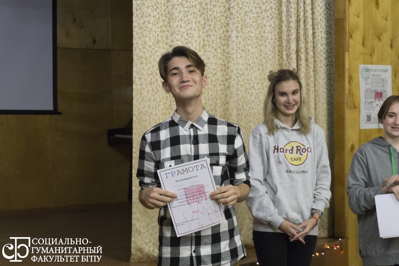 22 октября прошёл литературный вечер социально-гуманитарного факультета.  Во время мероприятия мы насладились и классической, и советской, и новой авторской литературой. Каждый выступающий вложил душу в исполнение, некоторые из участников раскрылись по-новому. Также мы имели удовольствие услышать исполнение участников, пришедших из другого университета.