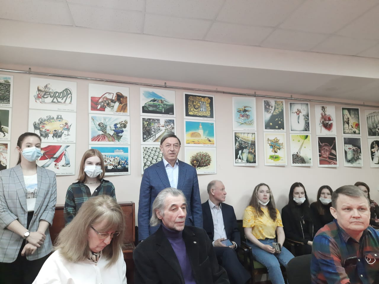 Выступили: Консул Болгарии Шредер Я.Ю.,Аброщенко В.В. - президент международной космической школы,Юрий Григорьев-карикатурист, Камиль Бузыкаев - карикатурист, Загвоздкин Г.А.-доцент кафеды ИЗО, Лаврентьев С.Н. и др.