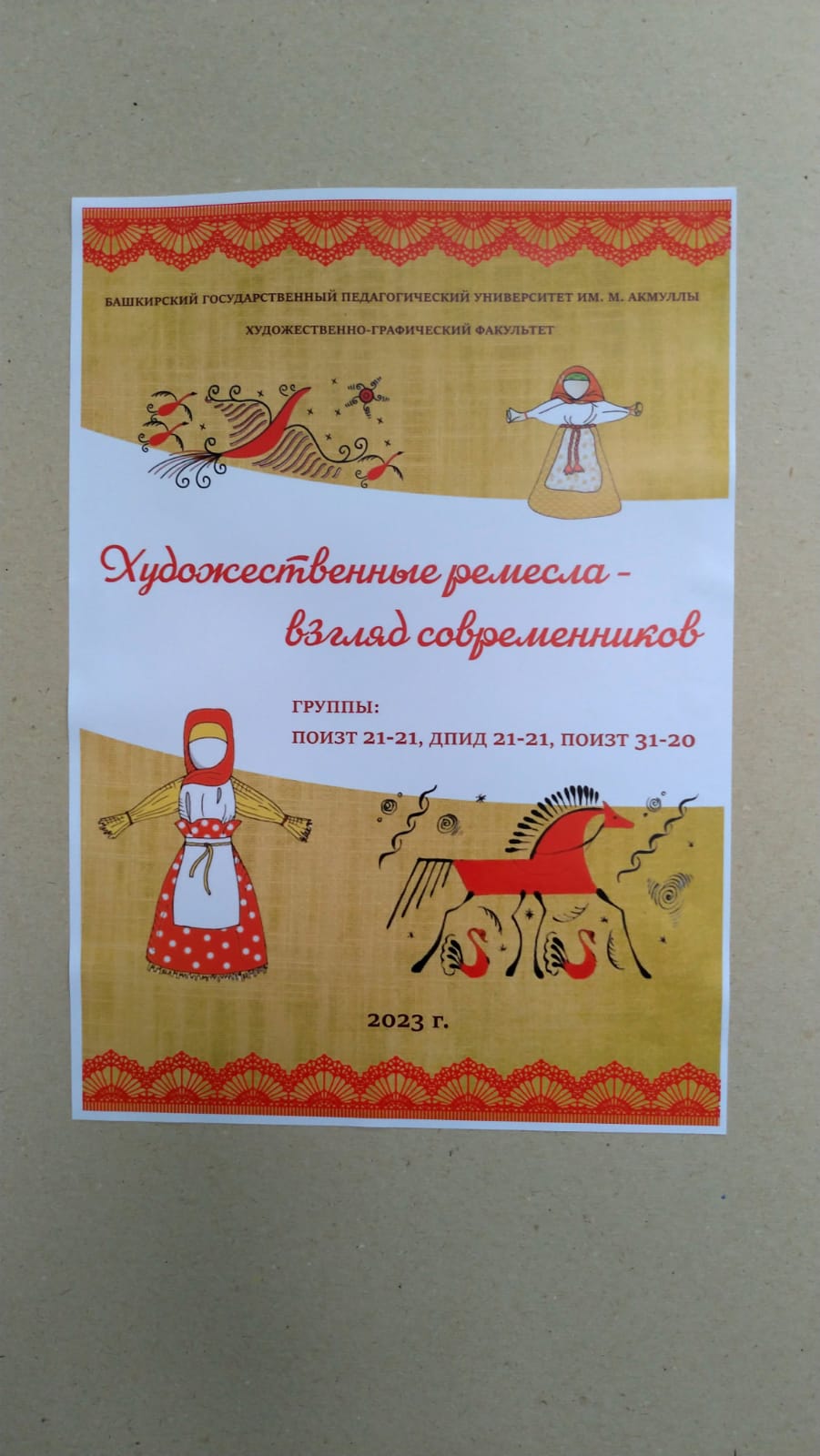 В переходе между 1 корпусом и помещением Технопарка очень уютно и как-то по-домашнему расположилась  выставочное пространство Художественно-графического факультета, в котором постоянно проходят выставки студентов и преподавателей. Сентябрь открылся отчетной выставкой творческих работ доцента кафедры Изобразительного искусства  Хайруллина А.Р. с его летней поездки в Санкт Петербург, в рамках повышения квалификации. Далее следовала отчётная выставка  студентов 3 курса, преподаватель  доцент Загвоздкин Г.А., о пленэрной поездке в Миньяр. Завершали год работы дизайнеров 4 курса в технике сухого валяния и ложного витража, преподаватель Моисеичева Л.Е., которая также выставляла свои творческие работы, в технике шерстяной скульптуры.       Пришел «Разгуляй»  неделя Масленицы, а вместе с ней народная, авторская кукла. Расписные  деревянные поверхности разной формы, представили студенты 2 и 3 курса художественно-графического факультета, преподаватель Елхина А.В.. На выставке можно увидеть две работы Елхиной А.В., /Царь и Семья/, которая не только отличный художник, но и лауреат премии им. М. Нестерова. Одно сменяет другое, второй курс теснит третий, не сдает позиций и 4 курс!  Выставка не требуют Пушкинской карты, свободного времени. Обеденный перерыв, дорога домой может проходить по переходу между Технопарком и 1 корпусом. Заинтересовываем, зовём, рады вас видеть, заходите, смотрите, удивляйтесь, радуйтесь!