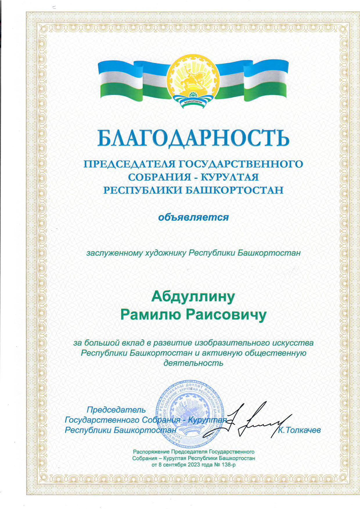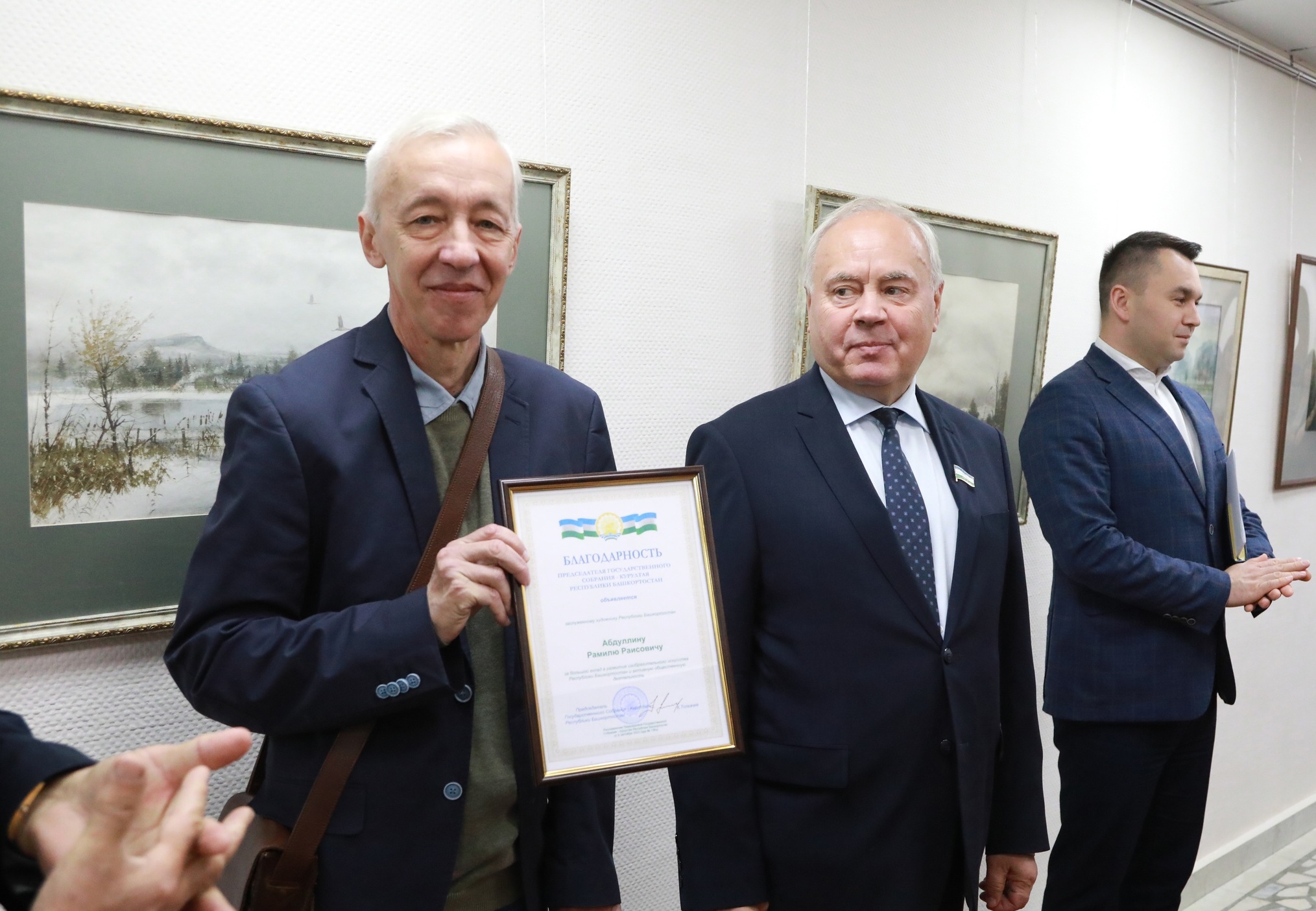 Председатель Государственного Собрания Константин Толкачев отметил самобытность художественного стиля автора и выразил художнику признательность за организацию выставки в стенах парламента. Рамилю Абдуллину вручили благодарственное письмо Председателя Государственного Собрания – Курултая Республики Башкортостан за большой вклад в развитие изобразительного искусства Республики Башкортостан и активную общественную деятельность.