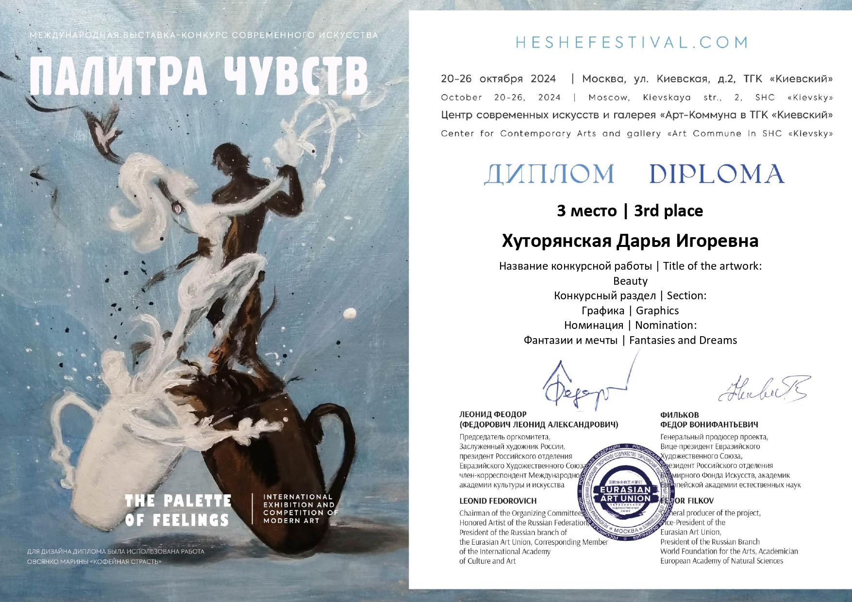 Поздравляем Хуторянскую Дарью студентку  1 курса Художественно-графического факультета БГПУ им. Акмуллы с 3 местом  в международной выставке-конкурсе «Палитра Чувств» в Москве!