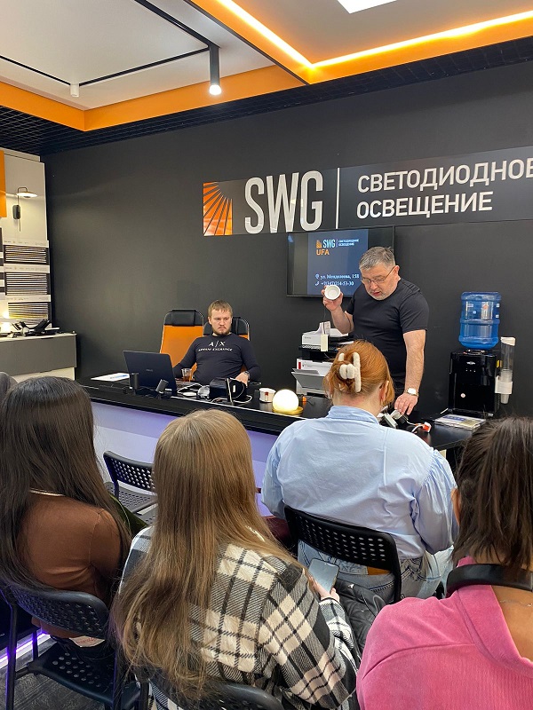 Интересную и познавательную лекцию по актуальным вопросам современного освещения в интерьере провели компания SWG, в лице директора и партнера Алексея Каравдина для студентов 3,4 курсов по направлению «Дизайн» и «ДПИ и Дизайн» БГПУ им. Акмуллы. Компания SWG специализируется на профессиональном дизайнерском осветительном оборудовании, имеет своё производство в России и занимается актуальными и техническими разработками в дизайне света. Алексей Каравдин в своей лекции рассказал как сила, направленность, теплота света влияет на восприятие интерьера и какое действие оказывает на психоэмоциональное состояние человека. Затронули темы программирования, новинок, системы «умный дом», колористики, ознакомились со стендами компании и образцами