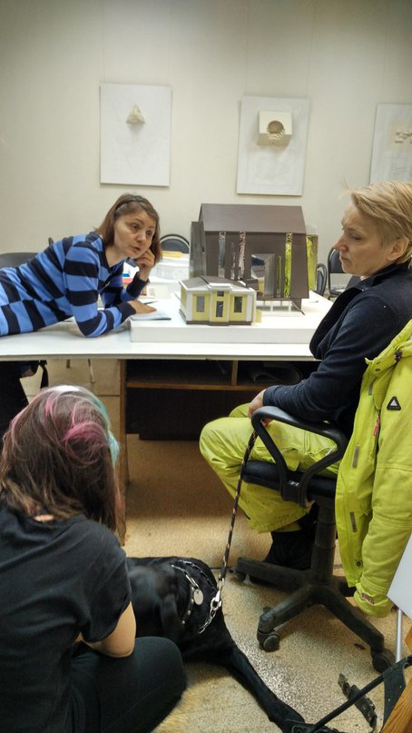 17 марта в макетной мастерской ХГФ состоялась встреча руководителей социальных проектов, направленных на помощь людям с тяжелыми нарушениями зрения, "Трогательный Башкортостан" (https://vk.com/trogatelnibashkortostan) Дорофеевой Е.Н. и "Прикосновение к Уфе" (https://vk.com/prikosnovenie_k_ufe) Азалиевой Е. и Исламгуловой А. с Хасановой Гузель Вилисовной - руководителем клуба владельцев собак-проводников «Актырнак» (https://vk.com/sobakaprovodnik) . Гузель Валисовна с интересом выслушала рассказ о проектах, дала дельные советы по их дальнейшему развитию. А ее верная подруга собака-повадырь Андора с удовольствием пообщалась со студентами.