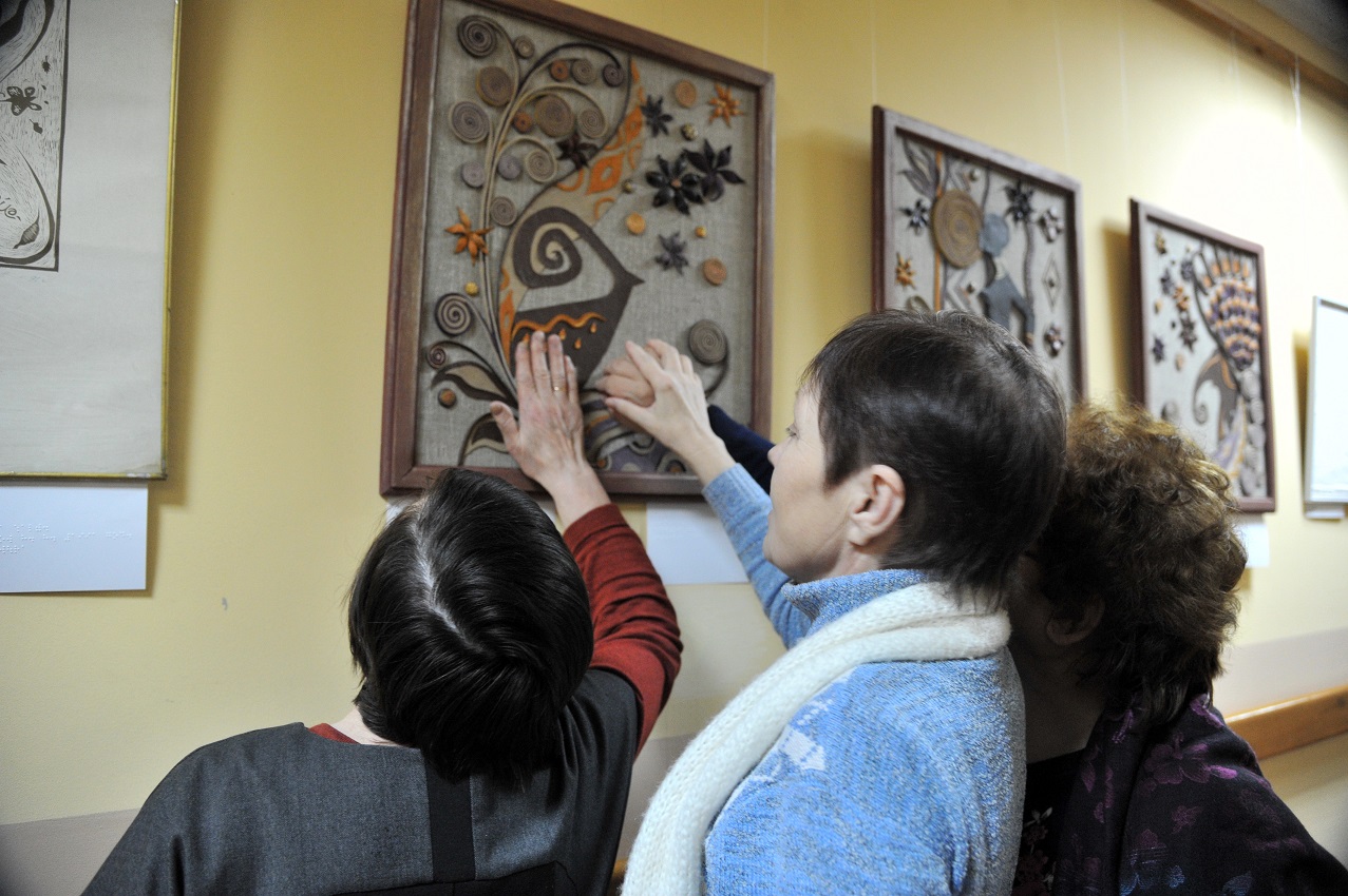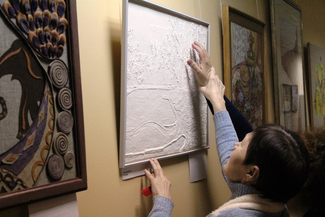Уникальность выставки состоит в том, что экспонируемые работы можно не только рассматривать, но и трогать руками, что актуально для людей с нарушениями зрения. В экспозиции представлены витражная роспись стекла, линогравюра, художественный текстиль, рельеф, художественная обработка кожи и бумаги и др.