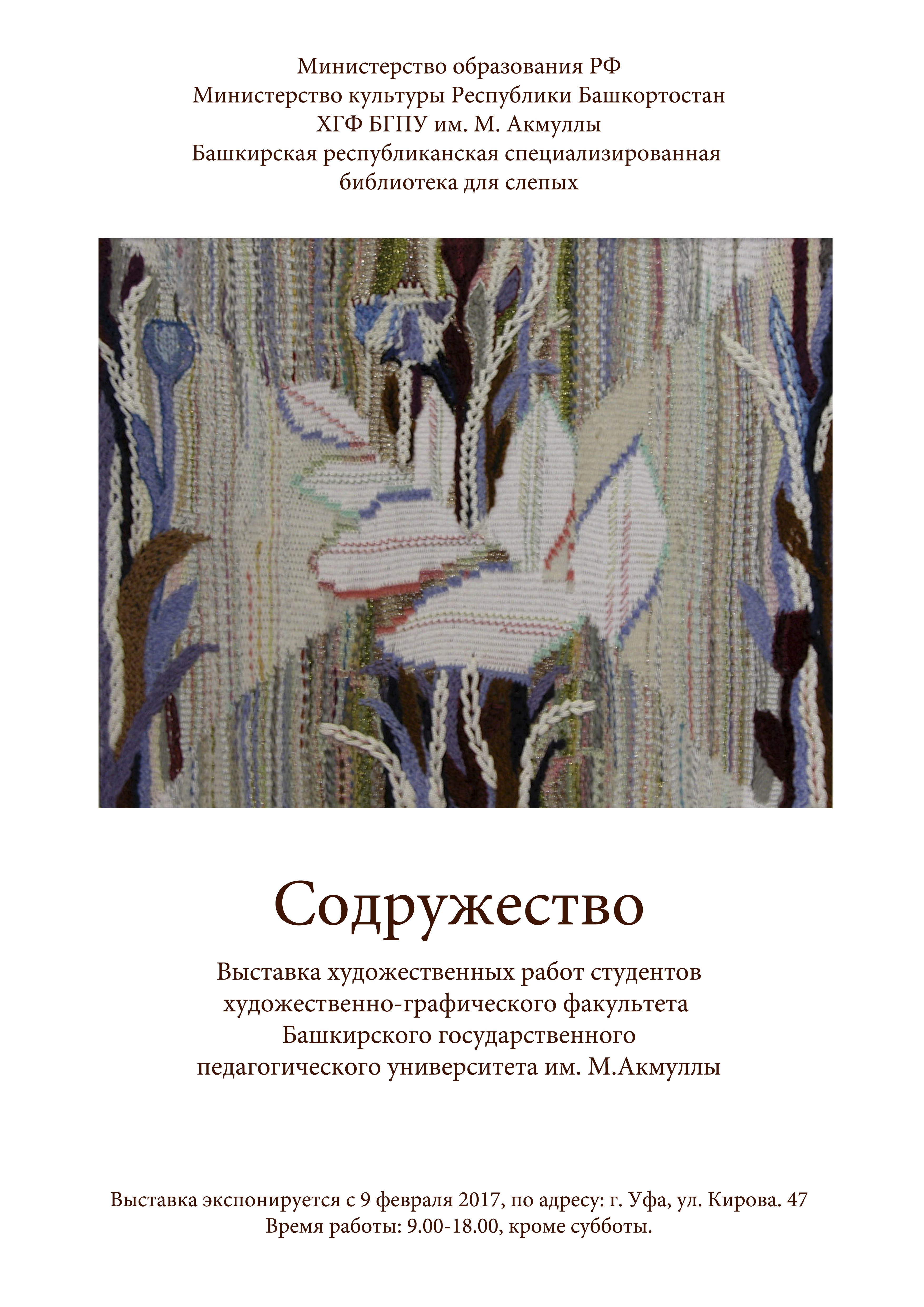 9 февраля в рамках договора о творческом сотрудничестве в Башкирской республиканской специальной библиотеке для слепых открылась выставка курсовых и дипломных работ, выполненных студентами Художественно-графического факультета Башкирского государственного педагогического университета им. М. Акмуллы.