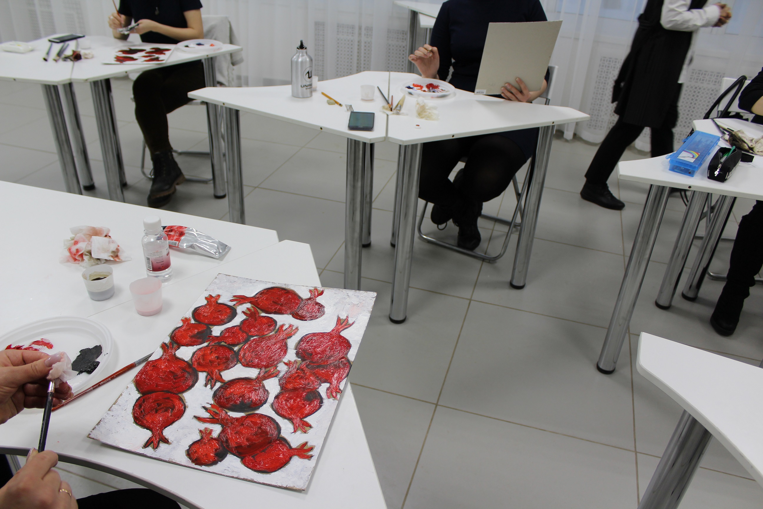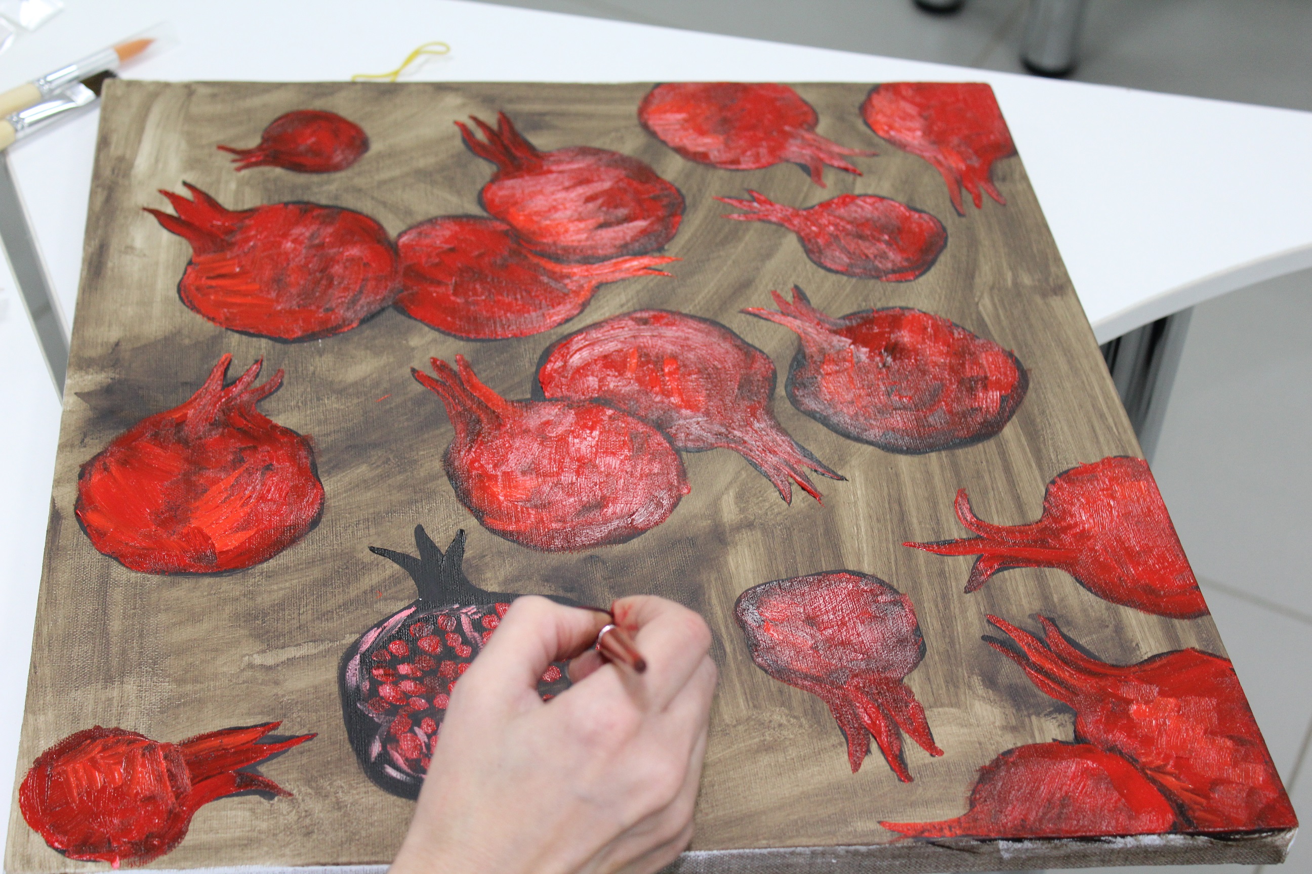 Итогом мастер-класса стало живописное полотно - «Гранаты», у каждого участника получилась своя работа, выполненная под чутким руководством Лианы Мкртчян. От лица художественно-графического факультета благодарим Лиану за ее труд, творческую атмосферу и готовность делится опытом с начинающими художниками.