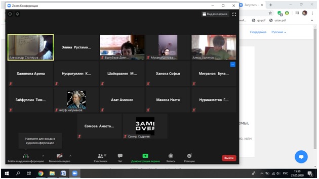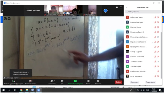 С 7 по 28 мая 2020 года «Научно-образовательный центр современных математических исследований» при БГПУ им. М. Акмуллы организовал дистанционные занятия по математике для 7-8 классов. Занятия проводились еженедельно (по четвергам) с 15.30 до 17.30 в онлайн-режиме в системе видеоконференцсвязи ZOOM.US. В связи с большим количеством желающих посещать эти уроки, были организованы 4 учебные группы: 2 группы для семиклассников и 2 – для восьмиклассников. Основная тематика онлайн уроков касалась теории чисел (теория делимости) и планиметрии (свойства треугольников и окружностей), уровень материала был рассчитан на достаточно мотивированных и способных школьников.