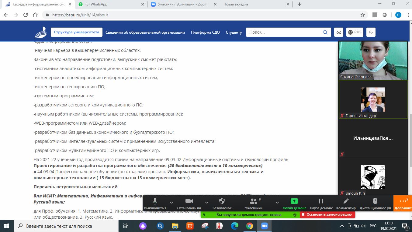 19 февраля 2021 года состоялась  профориентационная zoom конференция со студентами выпускного курса направления Мастер по обработки цифровой информации Уфимского многопрофильного  профессионального колледжа. Заведующая кафедры Старцева О. Г. рассказала о направлениях: Информационные системы и технологии и Прикладная информатика. Выступила студентка 4 курса кафедры "Информационных систем и технологий" Архипова Юлия, которая осветила вопросы студенческой жизни в университете. Также абитуриенты получили ответы на ряд интересующих их вопросов :