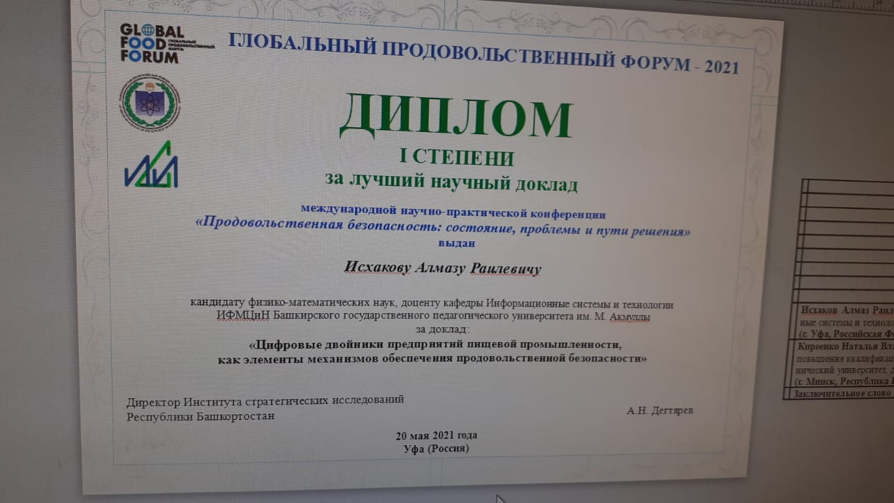 Исхаков Алмаз Раилевич – кандидат физико-математических наук, доцент кафедры Информационные системы и технологии ИФМЦиН выступил с докладом на тему "Цифровые двойники предприятий пищевой промышленности, как элементы механизмов обеспечения продовольственной безопасности". Его доклад был высоко оценен и удостоен Диплома первой степени за лучший научный доклад.