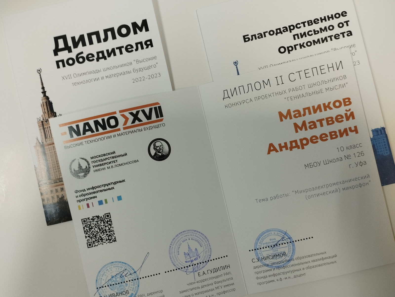 Учащийся 10 класса, Цыганов Матвей работал под руководством доцента кафедры физики и нанотехнологий к.ф.-м.н. Азата Фаатовича Галиева, над разработкой микроэлектромеханического микрофона на основе тонкой полимерной мембраны. Проект был представлен на Весенней Проектной Школе-конференции (ВПШ’2023) в МГУ.