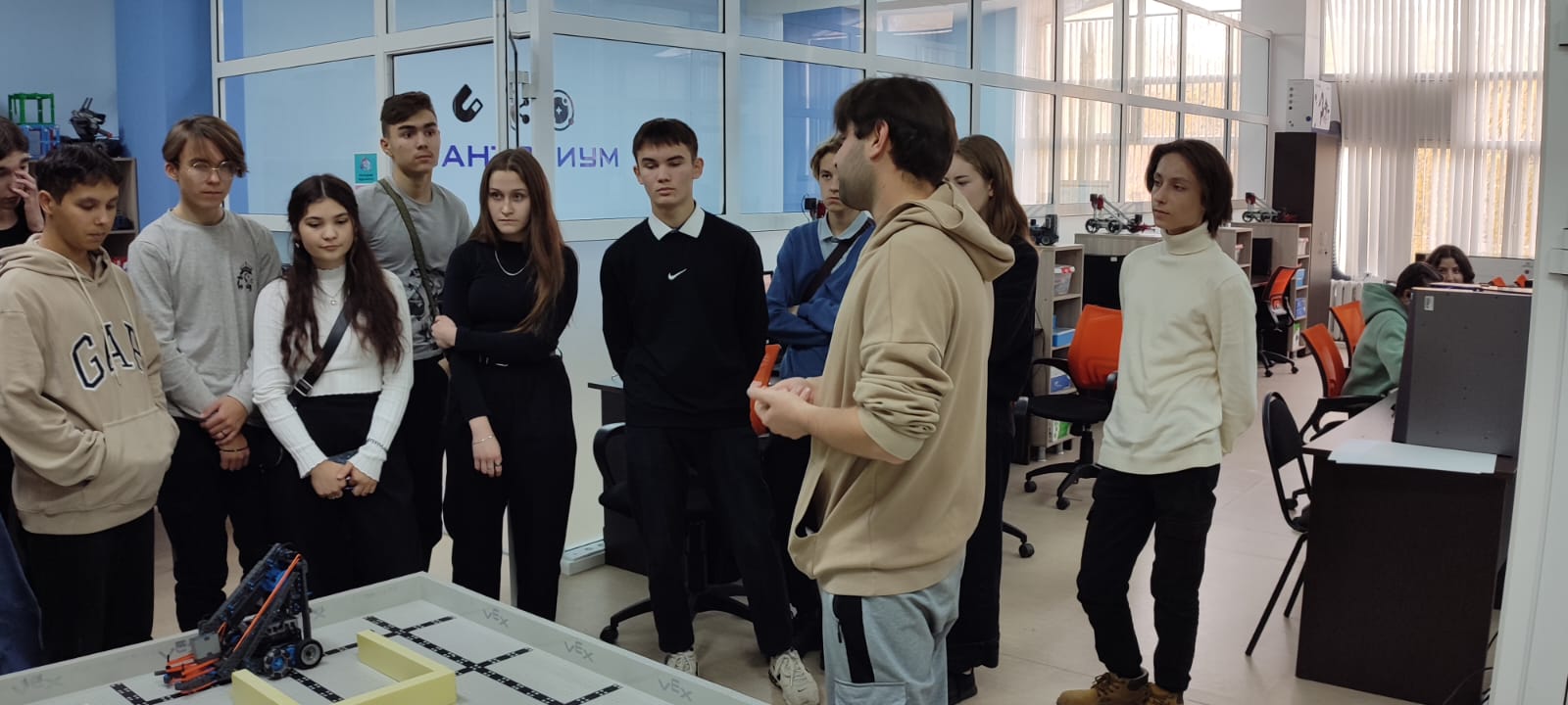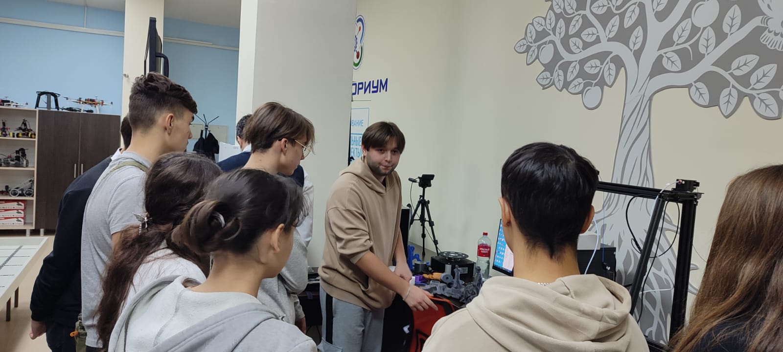 Далее для студентов колледжей директором ИФМЦН Юсуповым Азатом Равильевичем проведена экскурсия по Кванториуму им. Садовничева. Ребят очень заинтересовала имеющаяся возможность в БГПУ заниматься 3D-моделированием, робототехникой и VR-технологиями. При этом команды колледжей участвовали как в секции по разработке VR-сценариев, так и в секции по решениям задач банковского сектора.