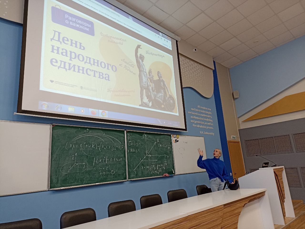 30 октября была проведена рубрика "Разговоры о важном". Ведущей, рассказавшей про День народного единства, стала студентка 4 курса группы ПОМ_ИНФ-41-20 Горшенина Ульяна. Урок был проведён со студентами группы ПОМ_ИНФ-11-23. Студентам рассказали о значимости данного праздника,а также показали фрагмент из фильма "Минин и Пожарский".