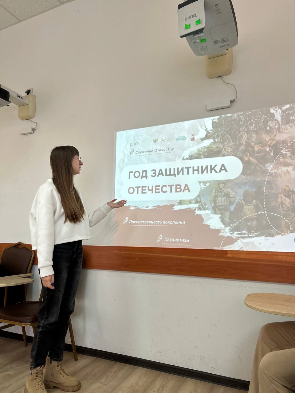 Ведущая рассказала студентам о важности года Защитника Отечества, напомнила о традициях празднования дней воинской славы России. Особое внимание было уделено современным героям, таким как участники специальной военной операции, которые сегодня стоят на защите Родины и её граждан.