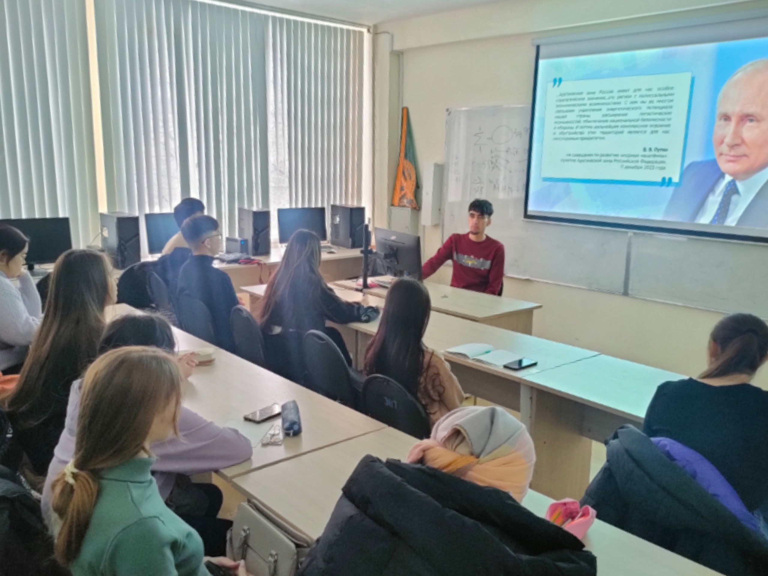Ведущий рассказал об истории освоения Арктики и направлениях её развития. Студенты также узнали и о создании атомного ледокольного флота и его значимости для Северного морского пути.