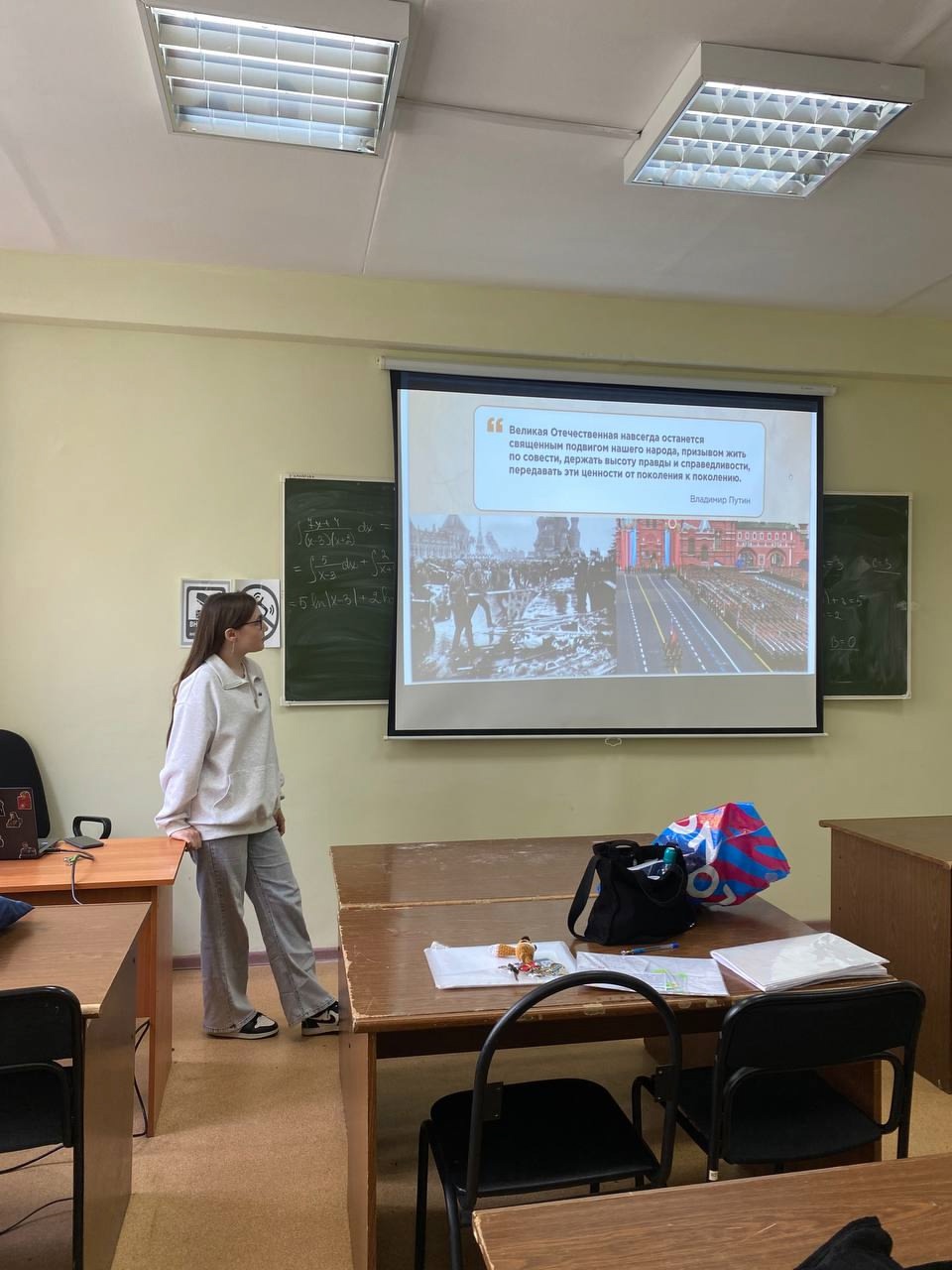 5 мая состоялась рубрика "Разговоры о важном". Ведущей стала студентка группы ПОМ_ИНФ-21-23 Разалина Сагдиева . Беседа была проведена со студентами группы ПОМ_ИНФ-21-23.