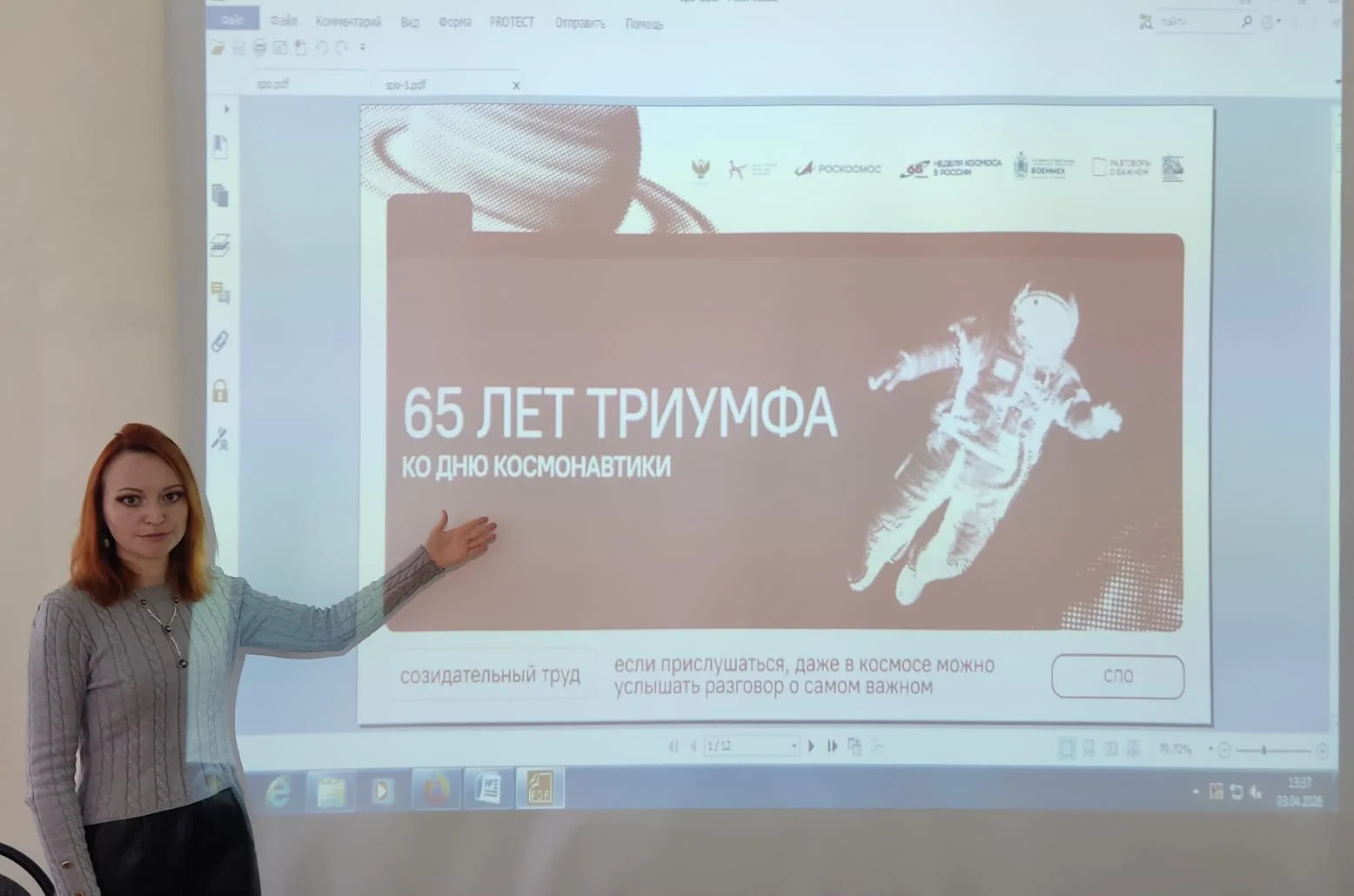 6 апреля 2026 года мы провели занятие, посвящённое 65-летию полёта Гагарина и 80-летию космической отрасли России. Обсудили, как исторический триумф нашей страны в космосе стал фундаментом для современных технологий и научного суверенитета. Говорили о ценности труда инженеров, конструкторов и космонавтов, чья работа — настоящая служба Отечеству. Занятие мотивировало студентов глубже изучать технические науки и помогло осознать связь между великим прошлым и амбициозным будущим российской космонавтики.