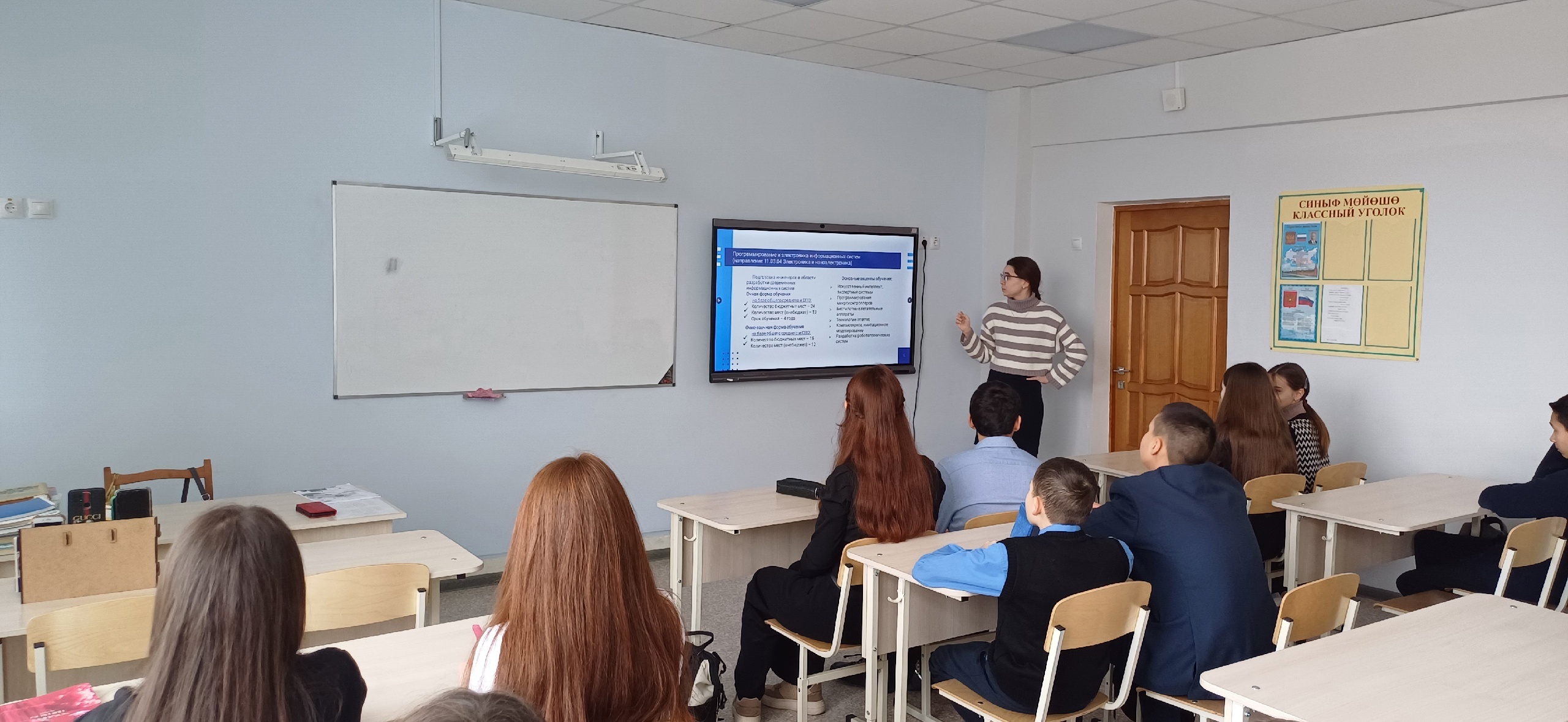 29 января 2024 года студентка ПОМ_ИНФ-41-20. Юнусова Элина провела профориентационное мероприятие на тему: "Правила приема 2024" в 10-11 классах МОБУ СОШ им. С. М. Чугункина с. Кармаскалы. Эллина  рассказала о правилах приёма в 2024 году в БГПУ им. М. Акмуллы. О том на какие специальности можно подать документы. Чем можно заниматься в свободное от пар время. О целевом обучении и минимальных проходных баллах ЕГЭ. Ученикам было