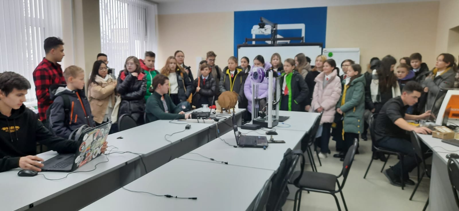 Гости ознакомились с оснащением лаборатории дополненной реальности, научно-исследовательским и технологическим оборудованием для изучения органических полупроводниковых материалов в широком диапазоне температур 6К-300К, а также учебными лабораториями инженерной и компьютерной графики, 3D-проектирования и печати, атомно-силовой микроскопии, рассмотрели станки с УПУ, робототехнику, беспилотные летательные аппараты и многое другое.