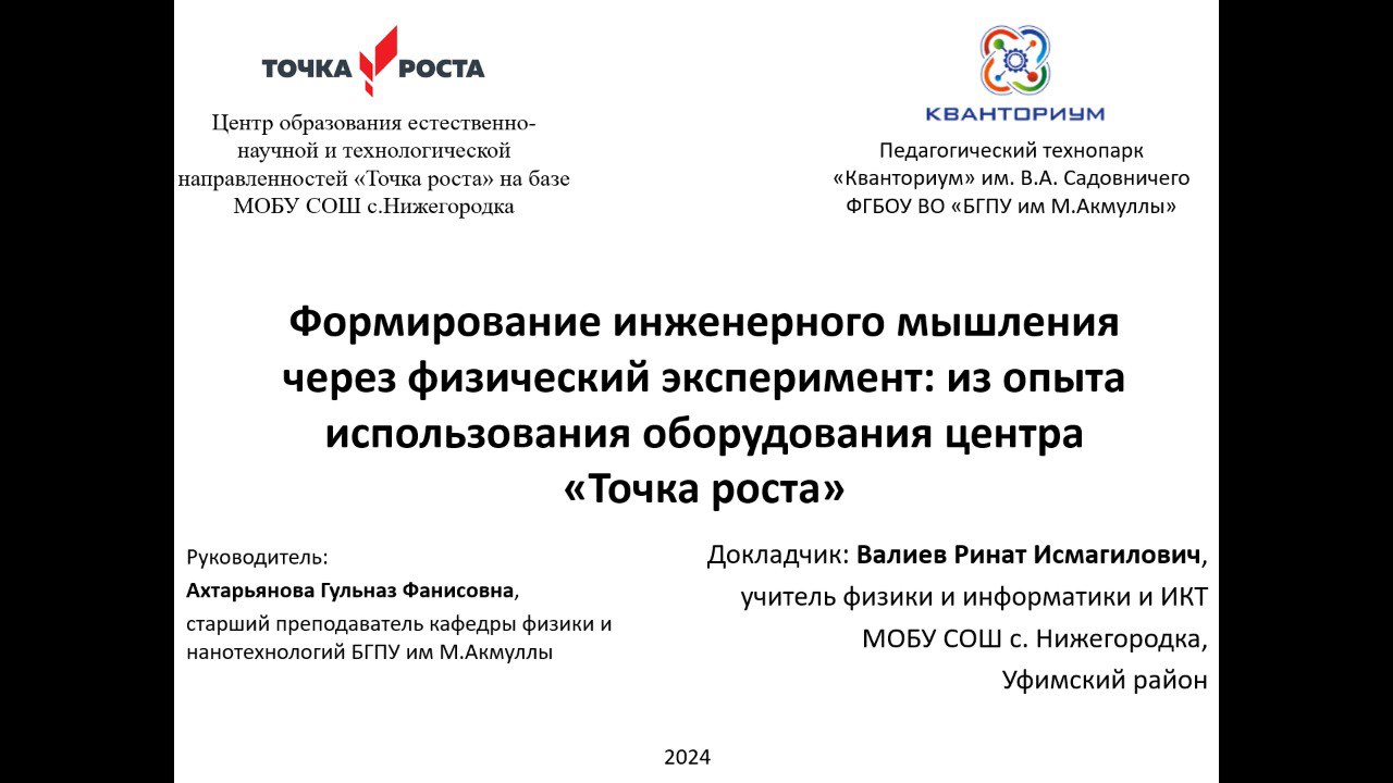 Также были представлены результаты исследования, выполненного на базе МОБУ СОШ с. Нижегородка Уфимского района учителем физики и информатики и ИКТ Валиевым Ринатом Исмагиловичем «Формирование инженерного мышления через физический эксперимент: из опыта использования оборудования центра «Точка роста»». Работа была проделана под руководством ст.преподавателя кафедры физики и нанотехнологий Ахтарьяновой Г.Ф., в рамках государственного задания №073-03-2024-046 от 18.01.2024 по теме «Создание адаптивной образовательной среды для опережающей подготовки учителей физики в инфраструктуре педагогического технопарка «Кванториум»».