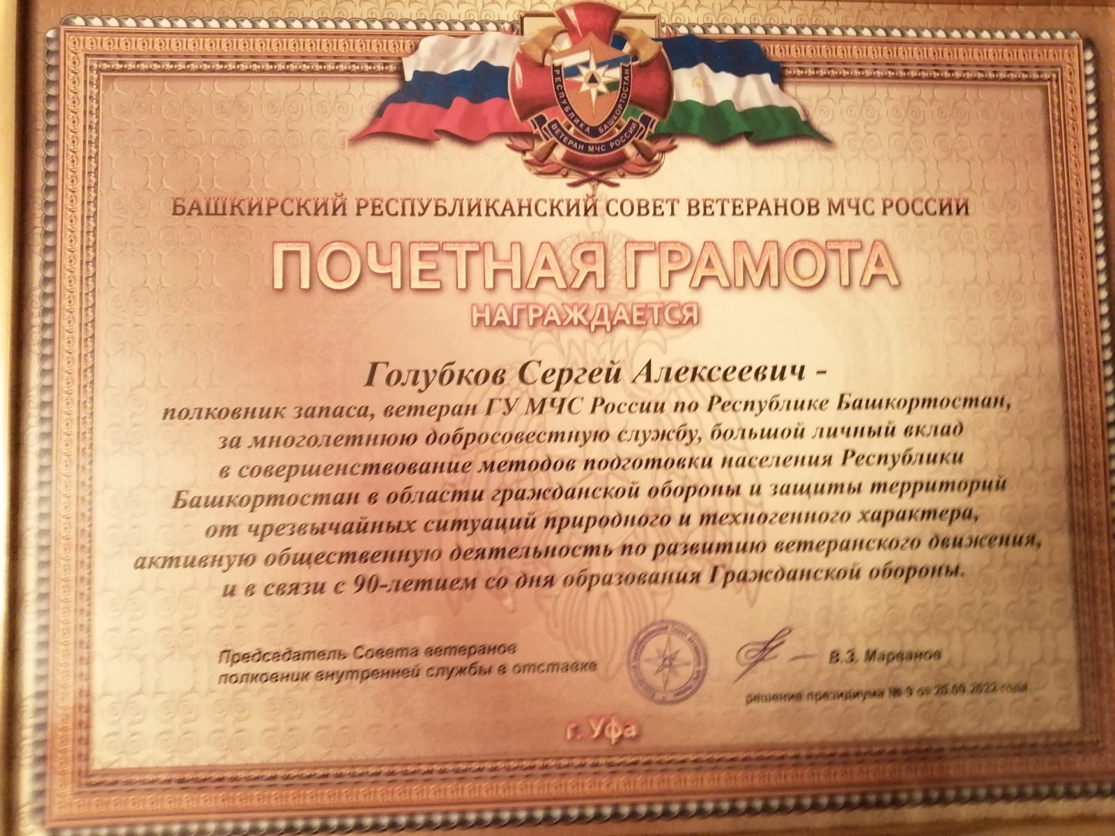На мероприятии, посвященном 90-летию гражданской обороны, Голубков Сергей Алексеевич, полковник запаса, ветеран ГУ МЧС России по РБ был награжден медалью "за доблесть" и почетной грамотой за многолетнюю добросовестную службу, большой личный вклад в совершенствовании методов подготовки населения Республики Башкортостан в области гражданской обороны и защиты территорий от чрезвычайных ситуаций природного и техногенного характера, активную общественную деятельность по развитию ветеранского движения