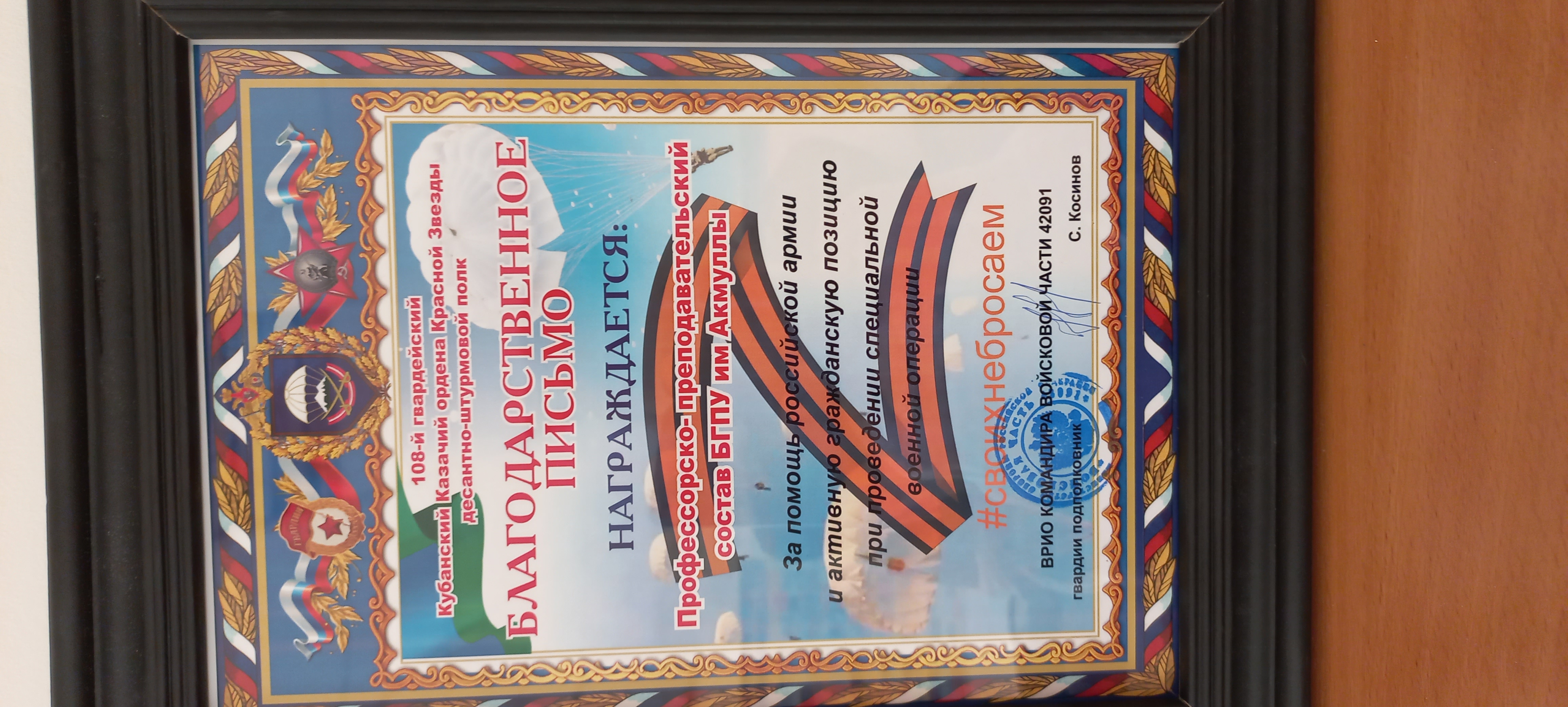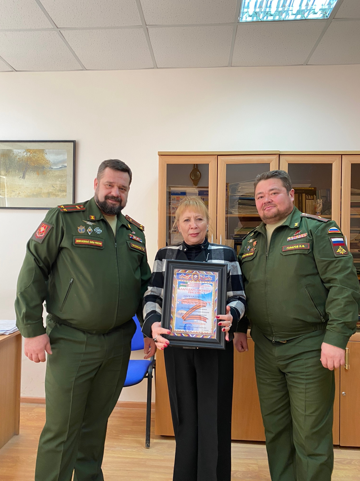 От имени командира войсковой части 42091 гвардии полковника С. Косинова преподавателям кафедры вручено Благодарственное письмо «За помощь Российской Армии и активную гражданскую позицию при проведении специальной военной операции». Оказалось, что скромная помощь преподавателей кафедры, в виде денежных перечислений и предметов первой необходимости, была доставлена бойцам именно данной войсковой части.