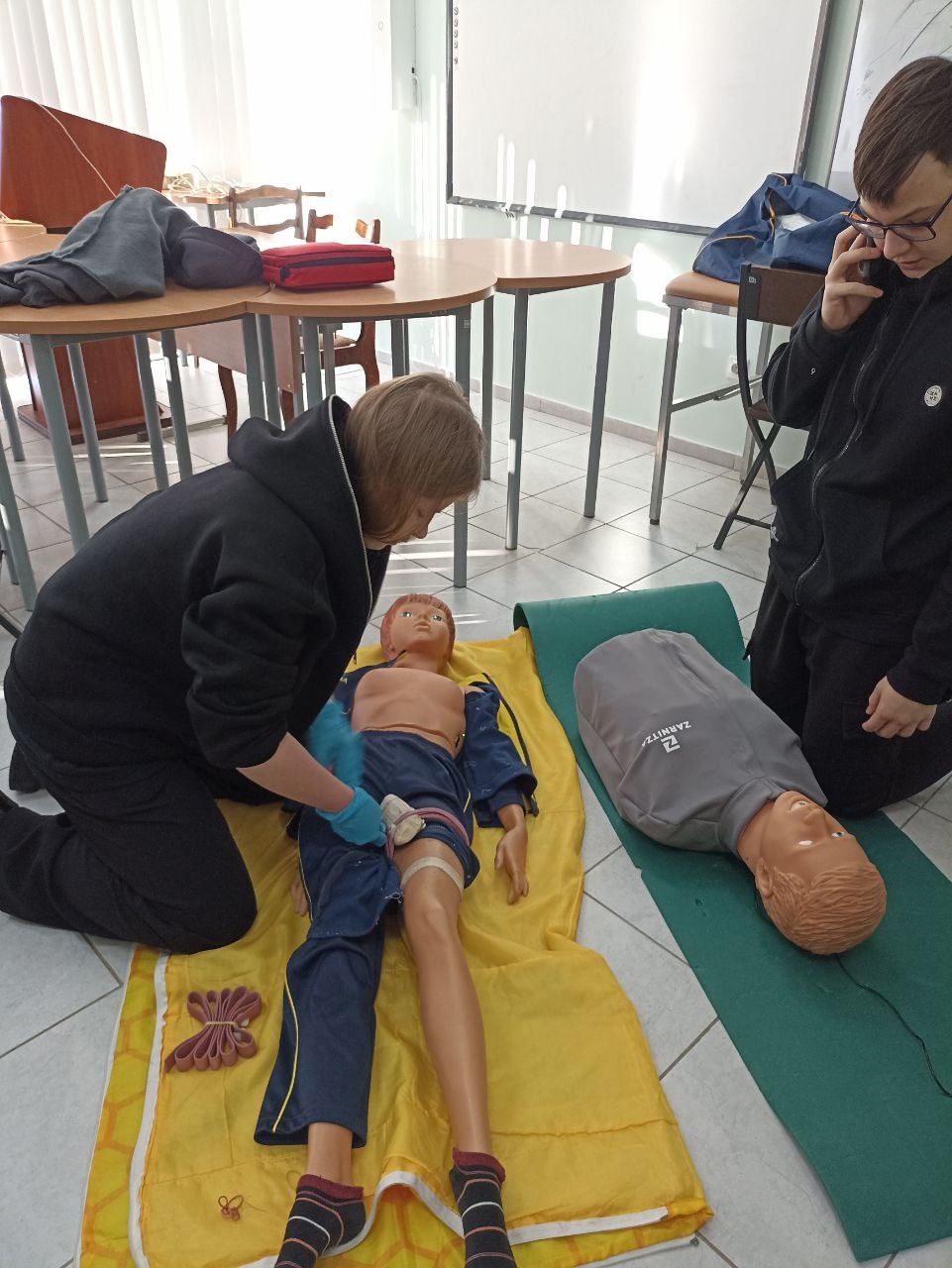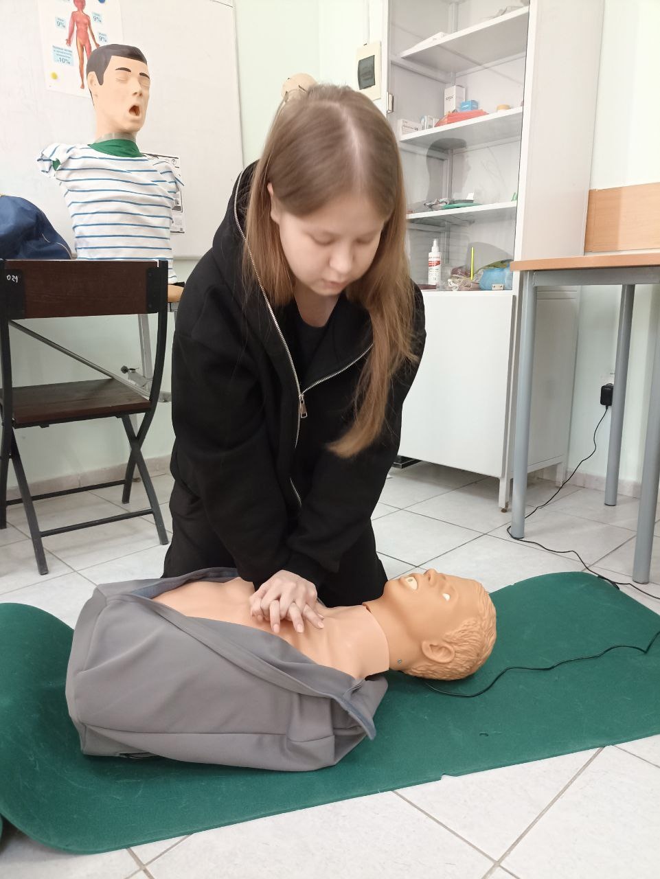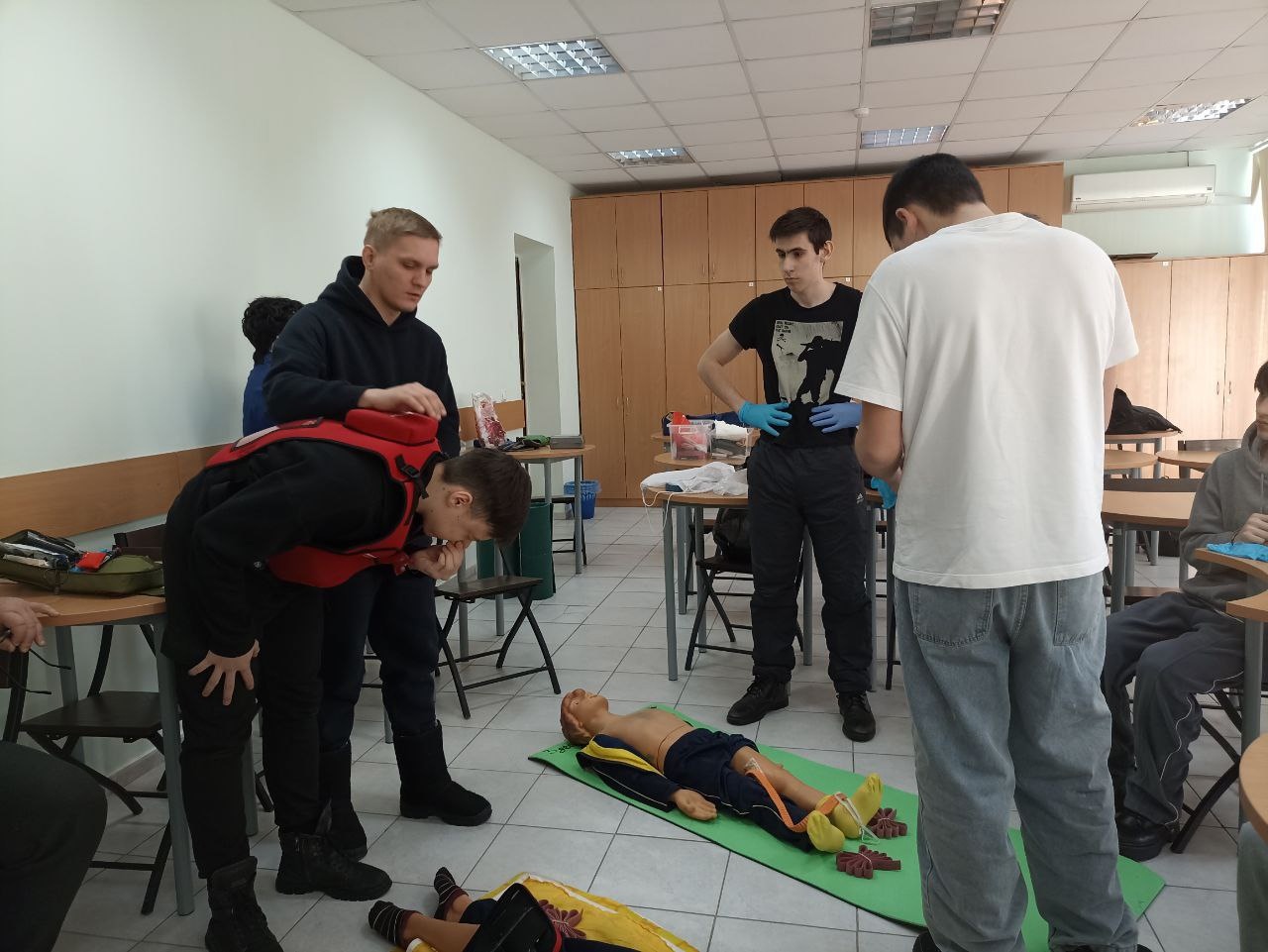 Под руководством доцента Гульшат Мануйловой и преподавателя Сергея Шерстобитова ребята активно отрабатывали практические навыки, необходимые при различных чрезвычайных ситуациях: от отсутствия сознания до травм и кровотечений. Участники мастер-класса научились оказывать помощь при отсутствии дыхания и кровообращения, наличии инородных тел в дыхательных путях, а также остановке наружного кровотечения.