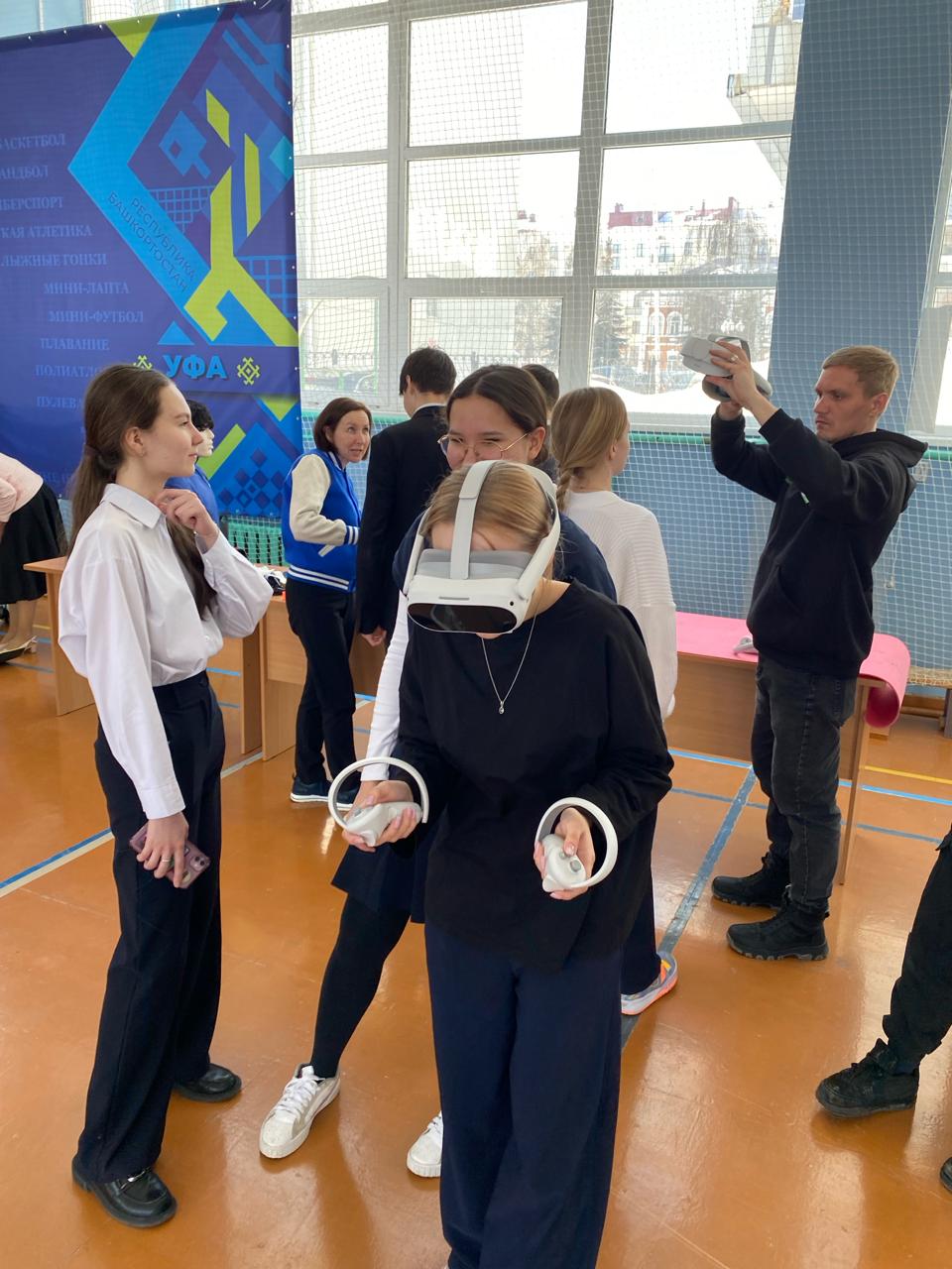 В программе Дня открытых дверей школьники участвовали в Мастер-классе от преподавателей "Очки виртуальной реальности", Игра-упражнение "Самая классная профессия",мастерская первой помощи в VR, готовимся к экзамену по ОФП, станция Мы за здоровый образ жизни: (дартс, спортивные игры, настольный теннис).  Школьников встретили с показательным выступлением народный коллектив спортивного-аэробического шоу "Страдл".
