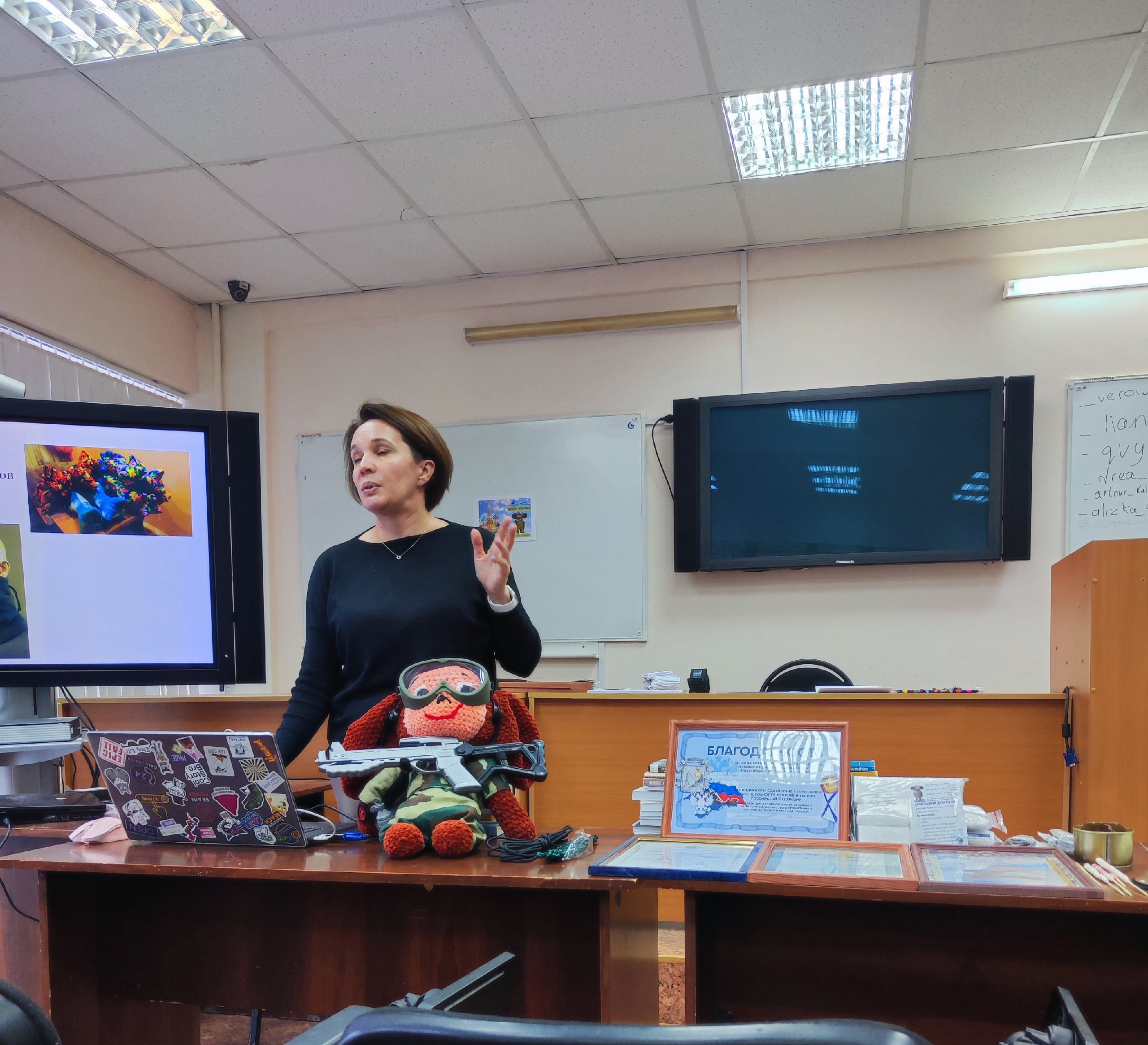 Во время лекции доценты кафедры Наталья Кузнецова , Гульшат Мануйлова подробно рассказали о различных направлениях добровольчества, акцентировав внимание на платформе #мывместе и сайте добро.рф. Участники узнали о том, как волонтеры изготавливают продукцию для поддержки участников специальной военной операции (СВО). Особое внимание было уделено тому, как именно эта деятельность помогает не только тем, кто находится на передовой, но и самим волонтерам, укрепляя их чувство единства и сопричастности к важному делу.