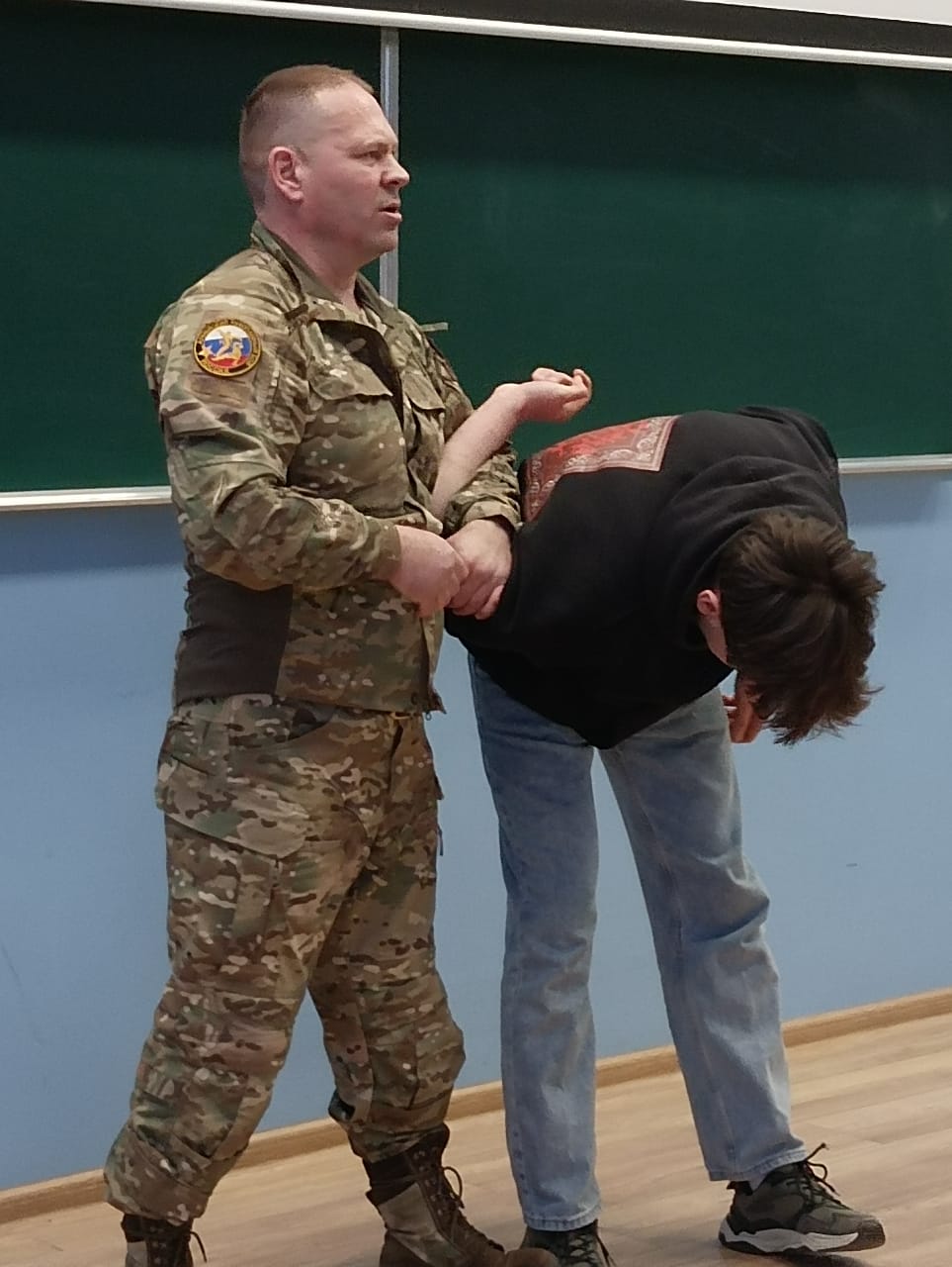 Инструктор по боевой и физической подготовке, ветеран СВО, командир разведроты и кавалер Ордена Мужества Артур Якупов поделился с участниками своими воспоминаниями о буднях защитников Отечества. Его рассказ о реальных боевых действиях и опыте службы стал важной частью мастер-класса, помогая студентам лучше понять психологию и физические аспекты защиты.
