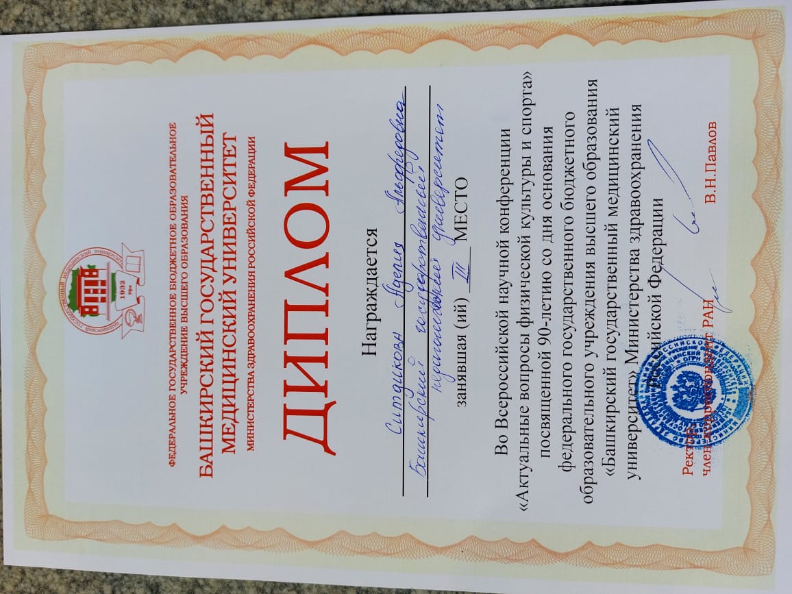 «Башкирский государственный медицинский университет» Министерства здравоохранения Российской Федерации. В этой научно практической студенческой конференции участвовали и студенты Института физической культуры и здоровья человека, где Ситдикова Аделия заняла III место.