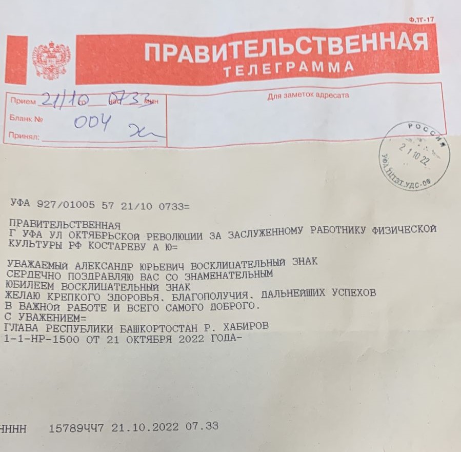Директор Института физической культуры и здоровья человека д.п.н., профессор Костарев А.Ю. отметил свой юбилей. В этот день глава Республики Башкортостан Хабиров Р.Ф. поздравил юбиляра, и пожелал крепкого здоровья и дальнейших успехов на научном поприще.