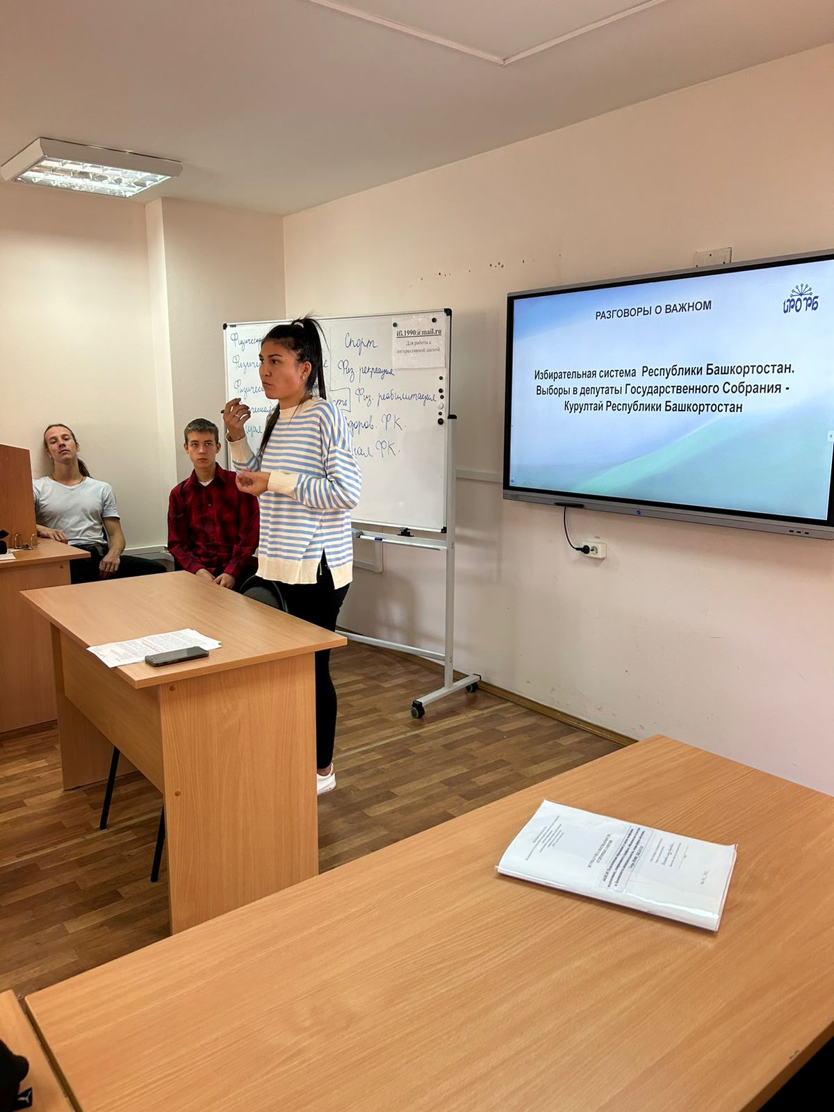 25 сентября 2023 года в Институте физической культуры и здоровья человека было проведено внеучебное занятие "Избирательная система России (30 лет ЦИК)" со студентами 1 курса группы Педагогическое образование профиль "Физическая культура и безопасность жизнедеятельности".  Цель занятия: формирование гражданской позиции студентов  и осознания ими необходимости приобретения опыта гражданской социально значимой деятельности.