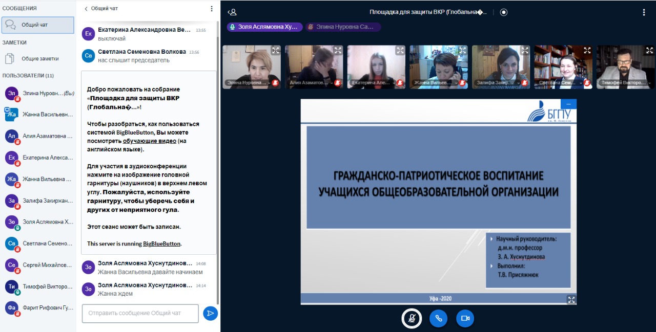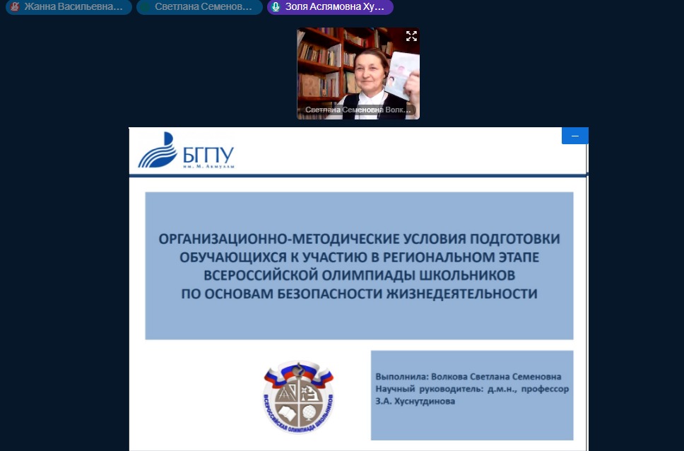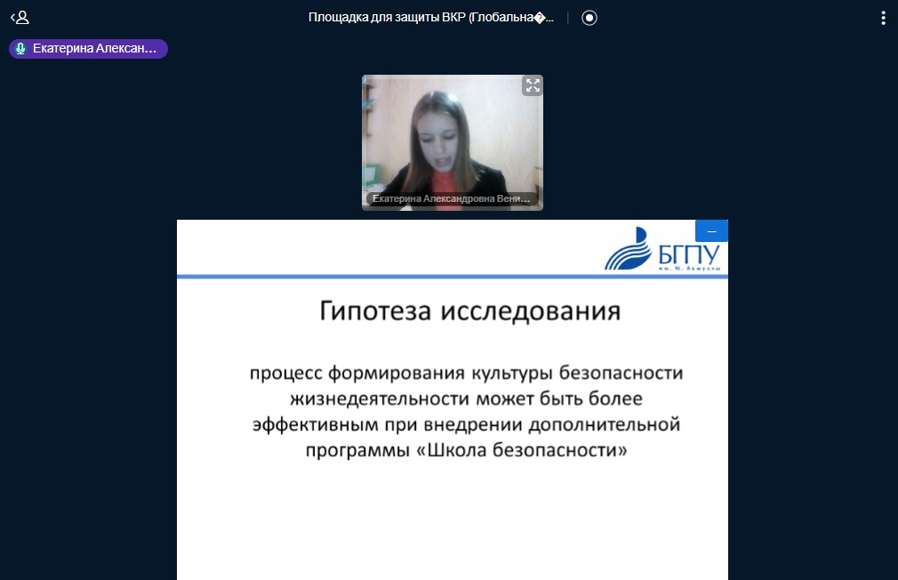 Дистанционный формат работы и учебы не стал препятствием к проведению защиты выпускных квалификационных работ по направлению «Педагогическое образование». Магистранты, обучающиеся по профилю «Образование в области безопасности жизнедеятельности» (с применением ДОТ) представили свои работы государственной аттестационной комиссии, в число которых входили: председатель Государственного комитета Республики Башкортостан по ЧС Фарит Гумеров, начальник отдела Министерства образования и науки РБ Жанна Миникеева, а также ведущие учителя ОБЖ Республики Башкортостан и преподаватели кафедры ОЗ и БЖ.