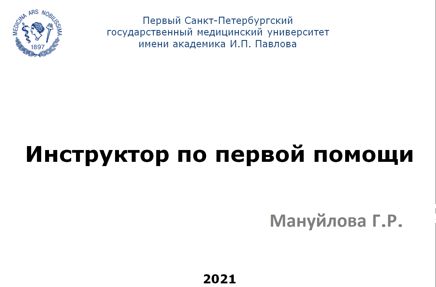 С 27 ноября по 2 декабря 2021 года  доцент кафедры ОЗиБЖ Мануйлова Г.Р. успешно прошла повышение квалификации по программам дополнительного профессионального образования «Первая помощь» и «Инструктор по первой помощи» на базе Первого Санкт-Петербургского государственного медицинского университета имени академика И.П. Павлова. Подготовка по программе «Инструктор по первой помощи» дает право Мануйловой Г.Р. проводить обучение других лиц приемам первой помощи.