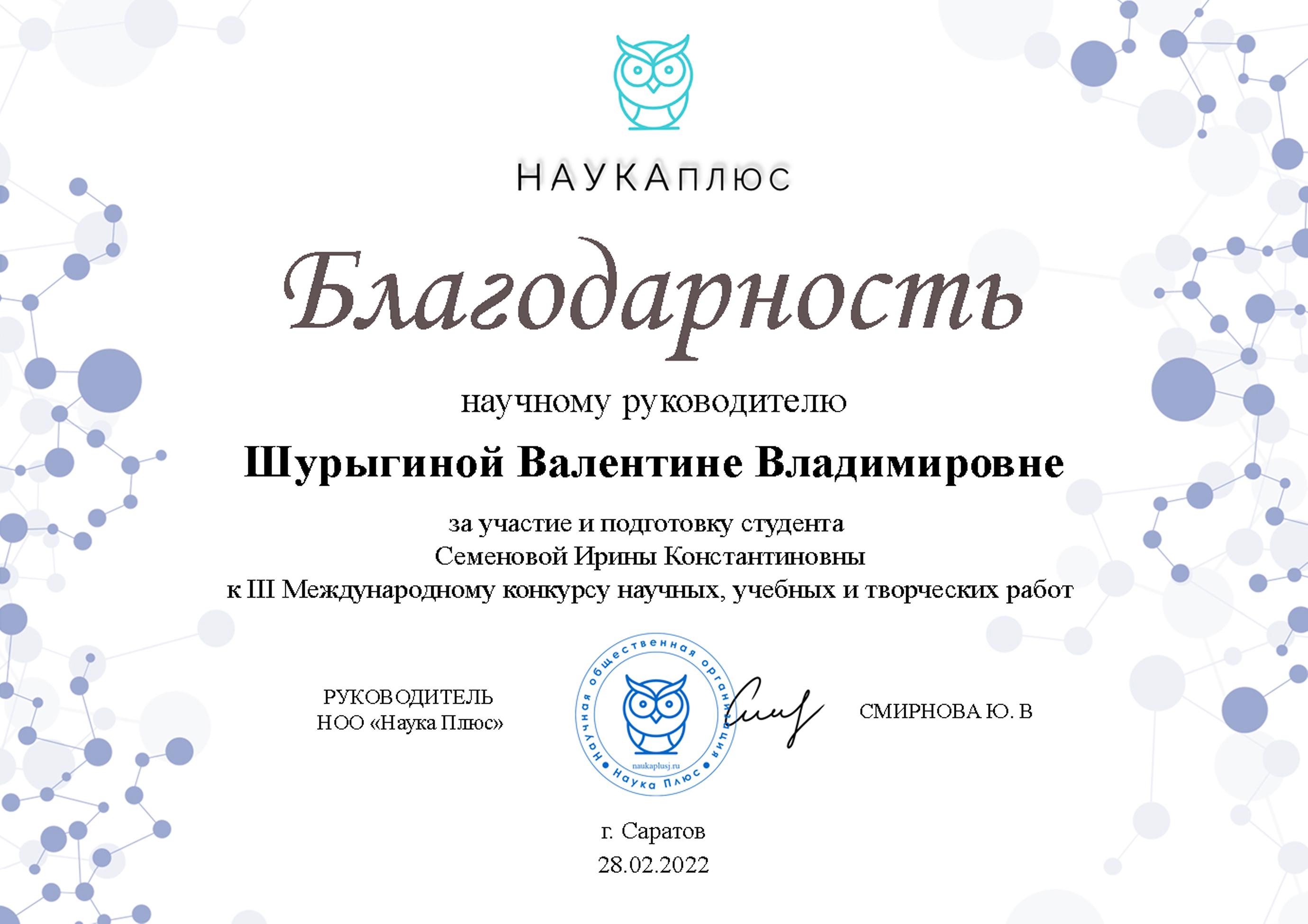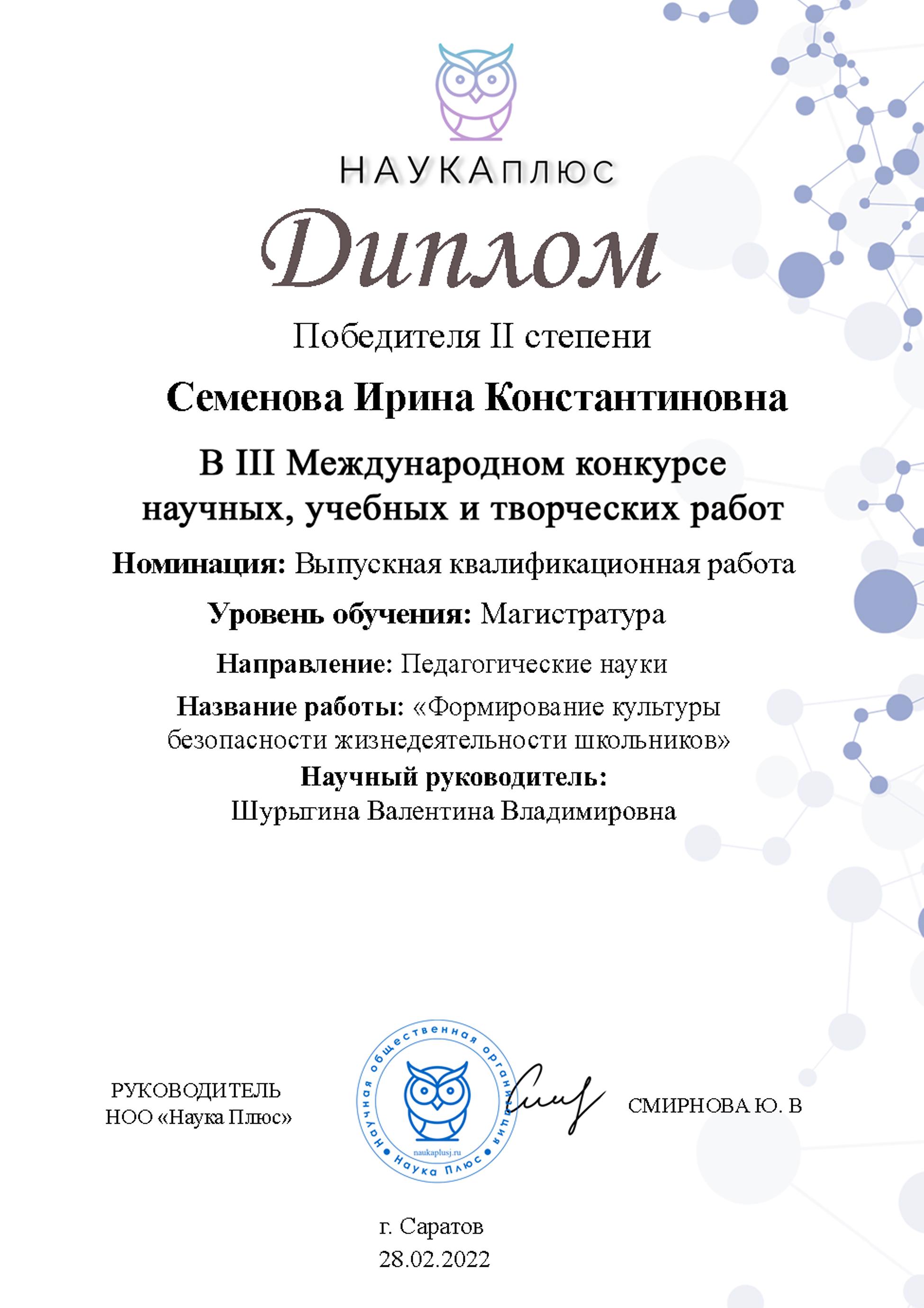 Подведены итоги III Международного конкурса научных, учебных и творческих работ «Наука Плюс». Магистрант Института физической культуры и здоровья человека БГПУ им. М. Акмуллы Ирина Семенова (направление: «Образование в области безопасности жизнедеятельности и здоровьесбережения») стала обладателем сразу двух дипломов победителя конкурса по направлению «Педагогические науки».