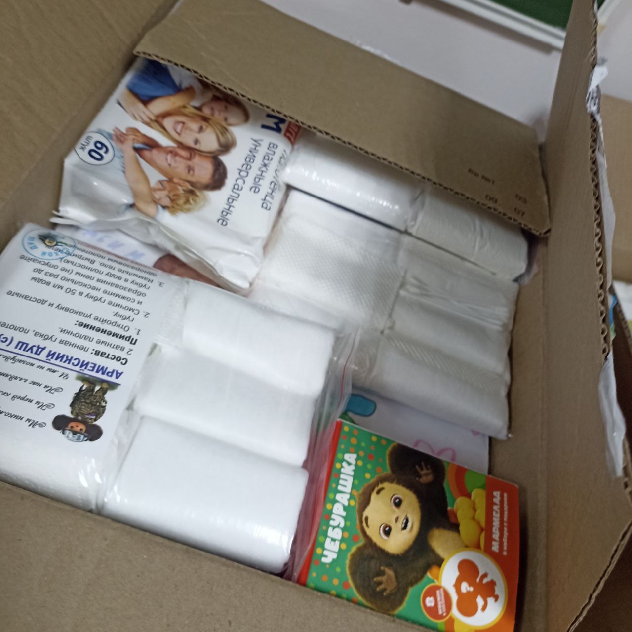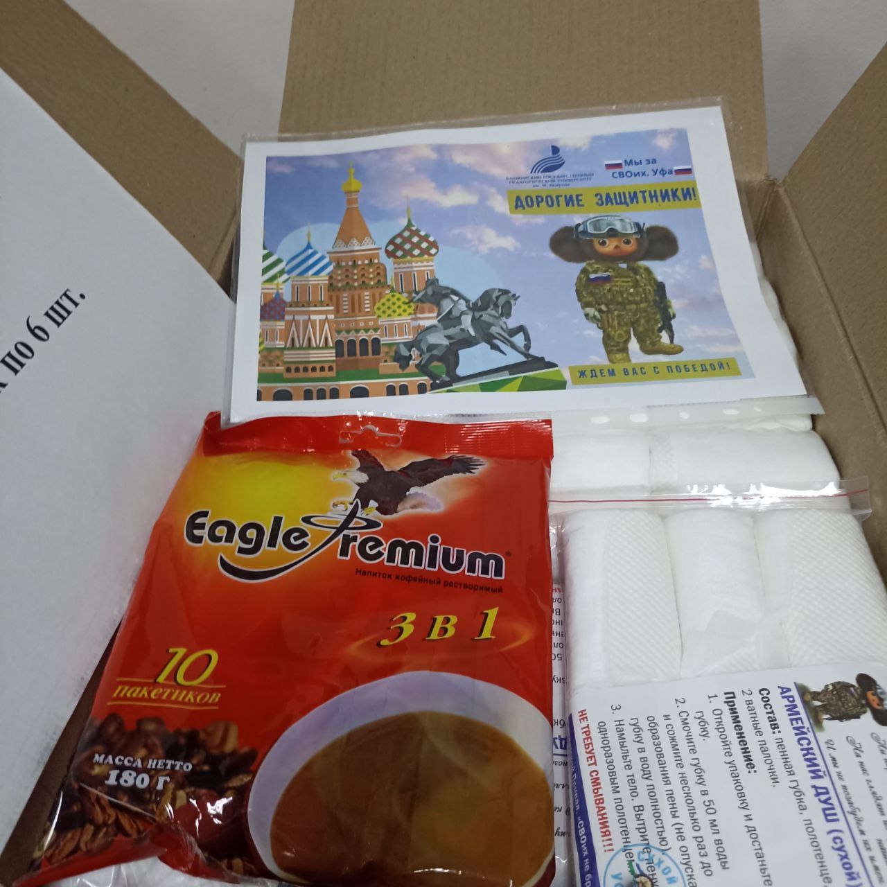 В этой партии — около 500 упаковок армейского сухого душа, а также чай, кофе, влажные салфетки и полотенца.