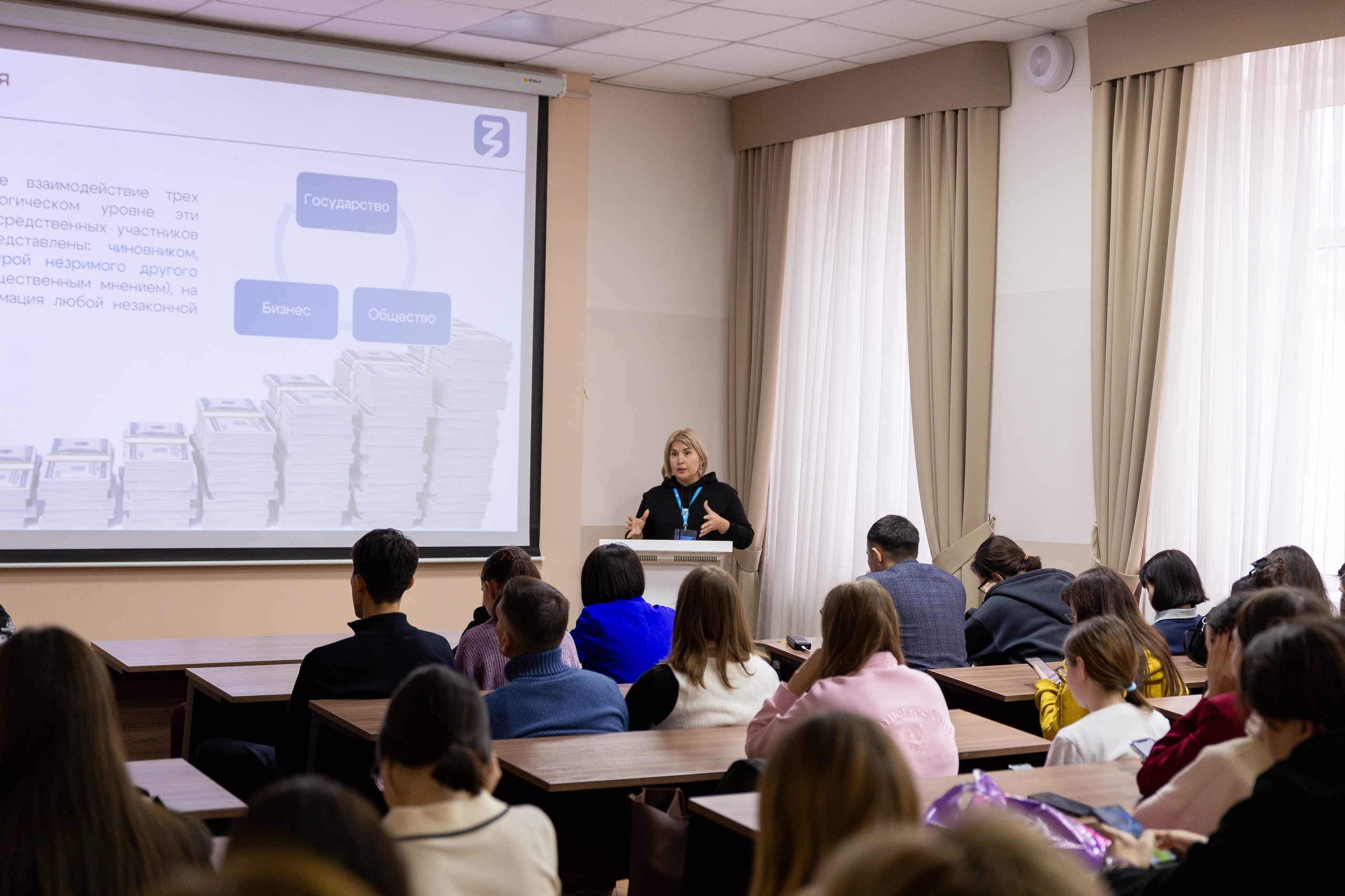 Первая лекция была посвящена психологическим аспектам коррупции и роли гражданского общества в борьбе с ней. Участники занятия узнали определение коррупции и ее признаки, познакомились с результатами социологических исследований об отношении людей к коррупции и сами приняли участие в одном из опросов. Элина Нуровна подробно рассказала, как эта острая для современного общества тема используется для манипуляции сознанием населения, привела яркие примеры мировых коррупционных скандалов. Большой интерес слушателей вызвал экскурс в историю коррупционных проявлений и борьбы с ними на разных этапах развития общества.
